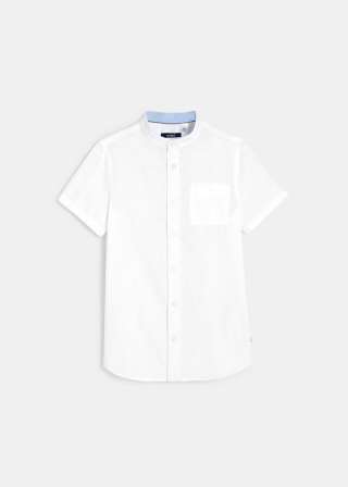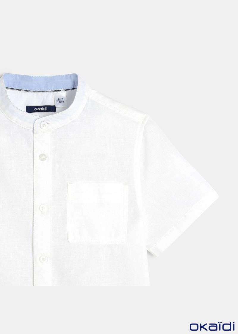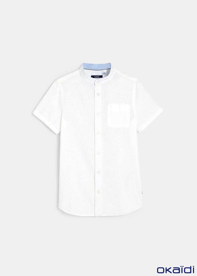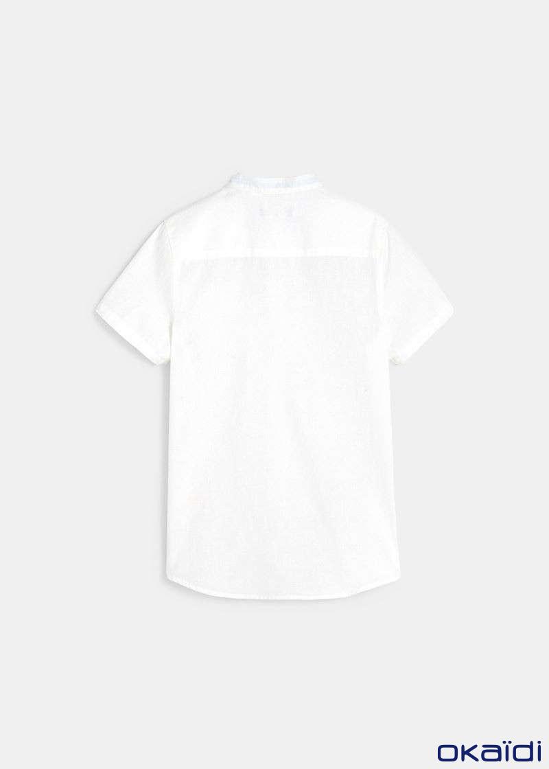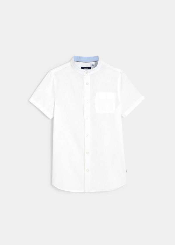 Стрејт фит кошула за момчиња од памучен поплин и лен, со ткаен ефект. Има мандаринска јака, копчиња по целата должина и 1 џеб на градите.