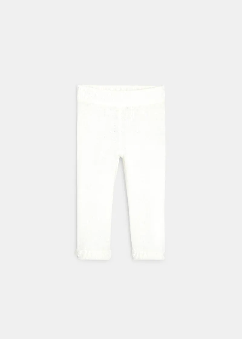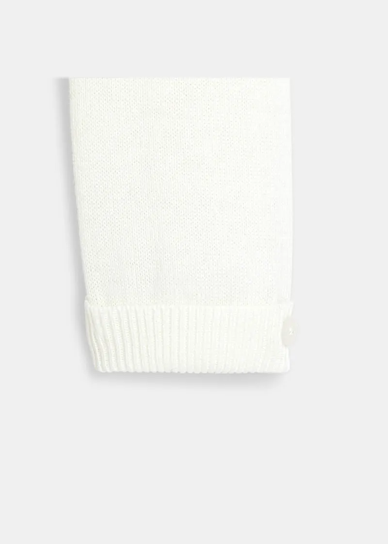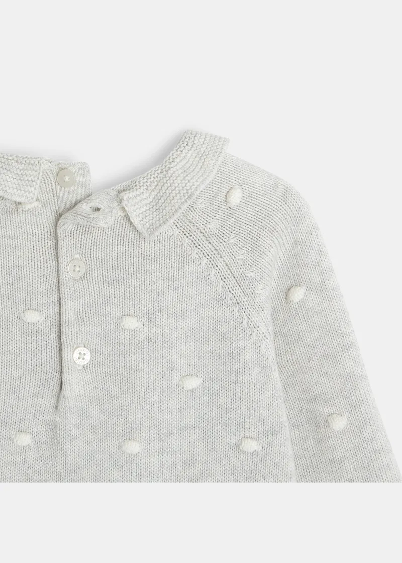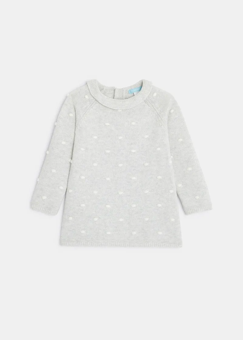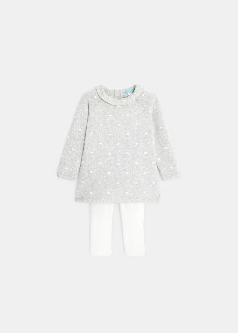Модерен бебешки комплет во бела плетена ткаенина, совршен за стилска зима. Топла, плетена ткаенина со жакардни помпони и голема јака со закочување на задната страна. Фустанот со долги ракави да може да се носи со или без бели плетени хеланки.