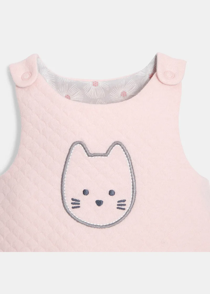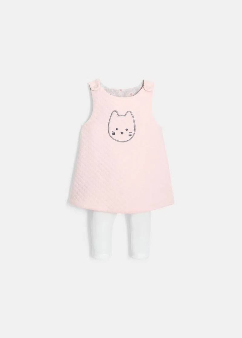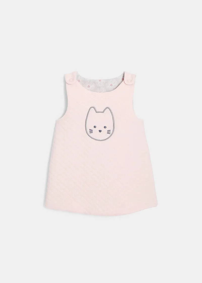 Овој фустан со две лица, може да се носи или во една боја, со везено маче или од страната со принтови за лесно менување на изгледот и криење на дамките! Се носи со бели хеланки со ластик на струкот, прицврстување на рамениците за лесно облекување.