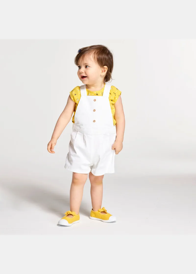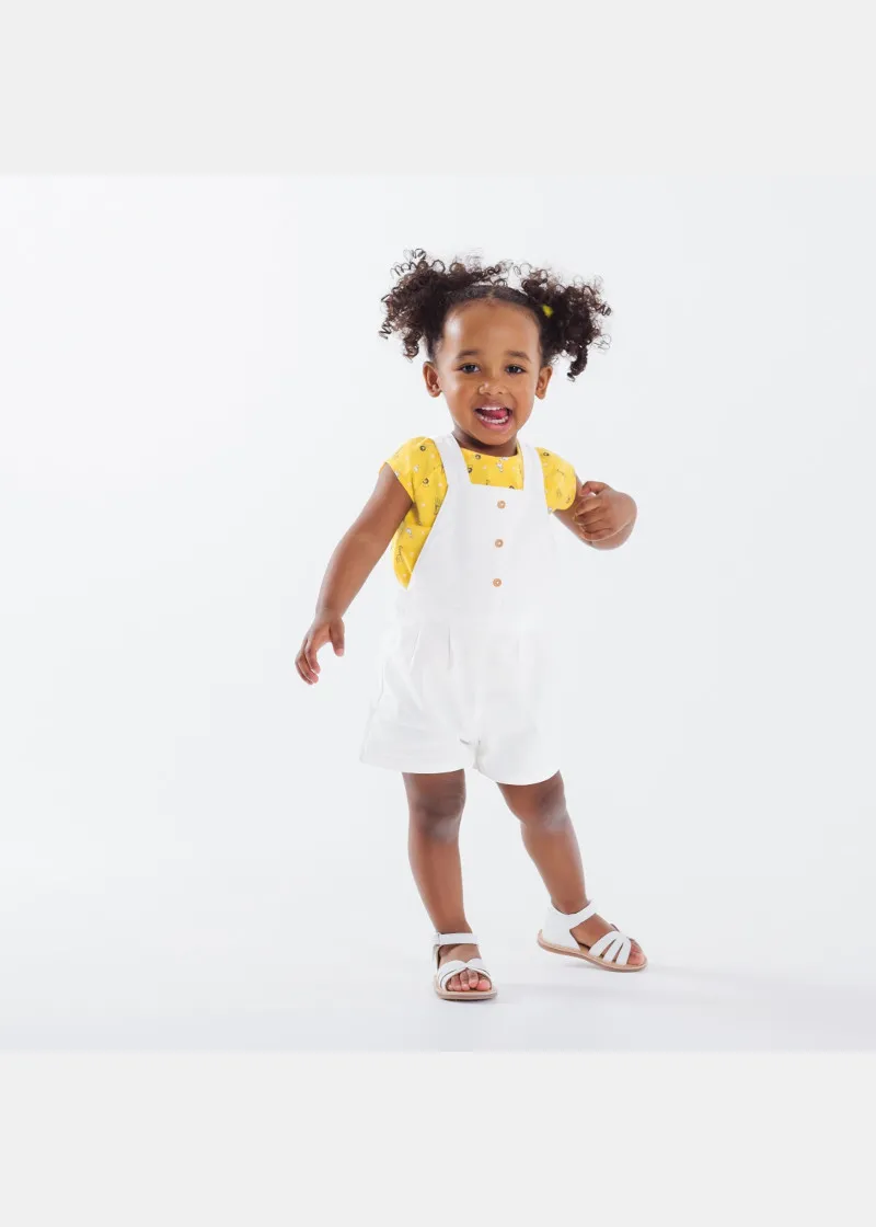 Авантуристички изглед за малите девојчиња со оваа маичка со мотиви од саваната. Комплетот за девојчиња вклучува и комбинезони со кратки ногавици и имаат три копчиња во предниот дел.