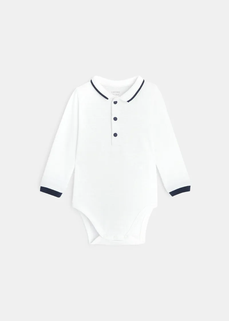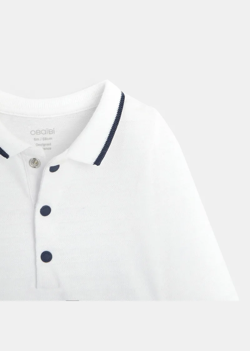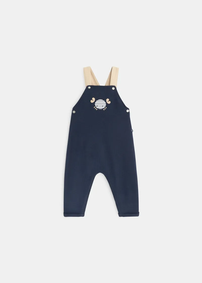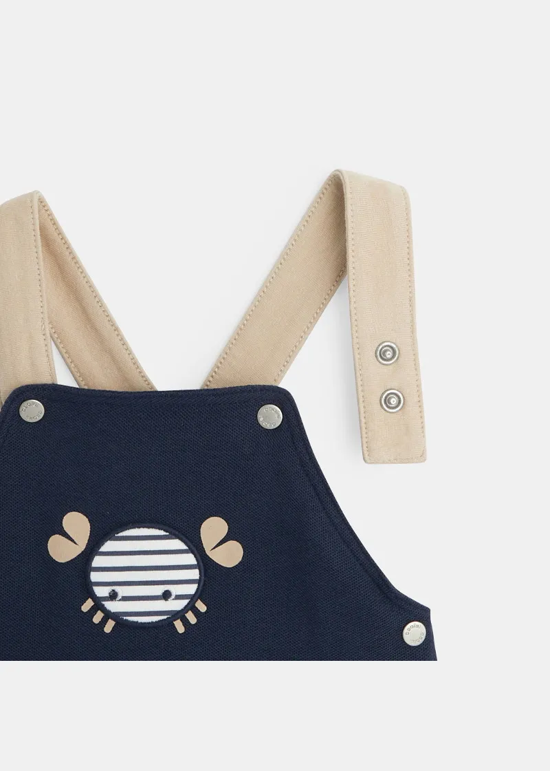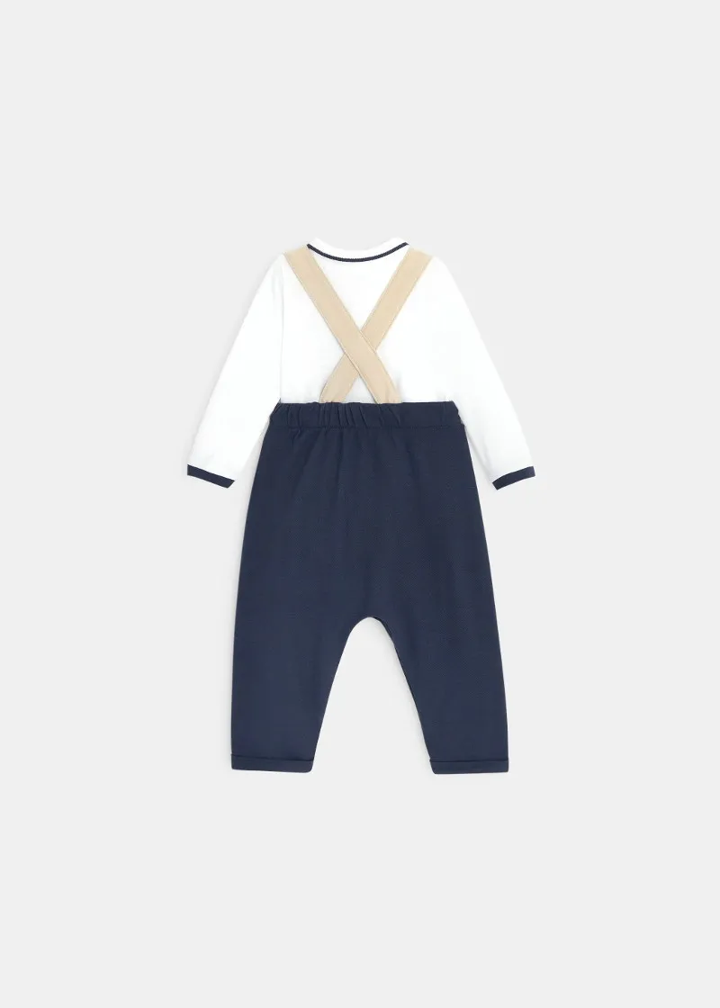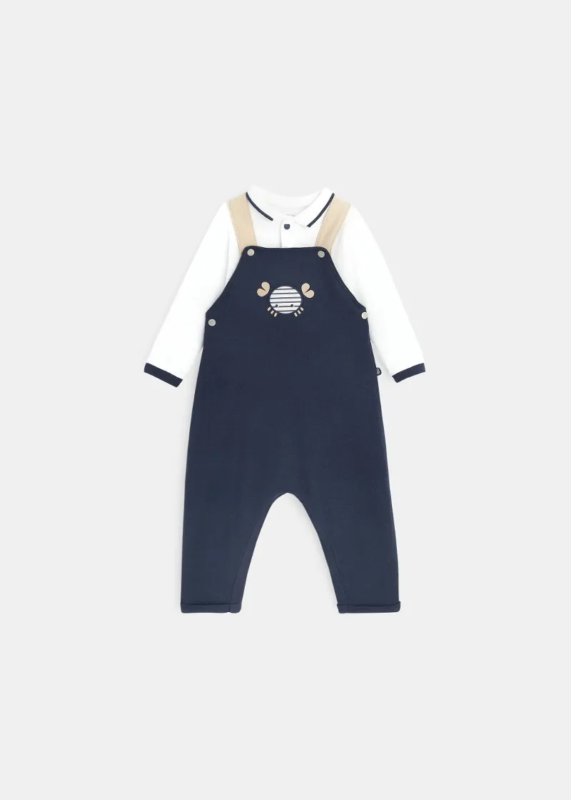 Комплет за бебе момче од комбинезони и блуза со долги ракави и јака. Шик и кежуал изглед за малите момчиња за прошетки покрај морето.