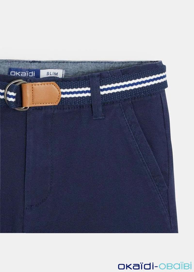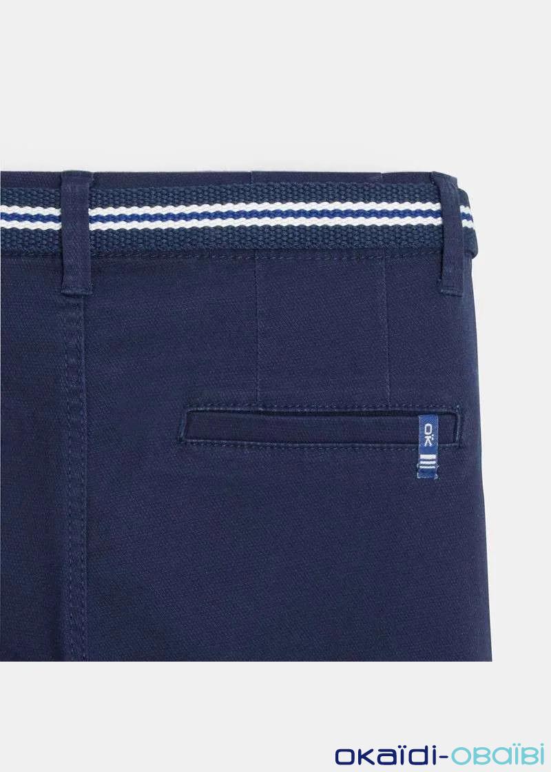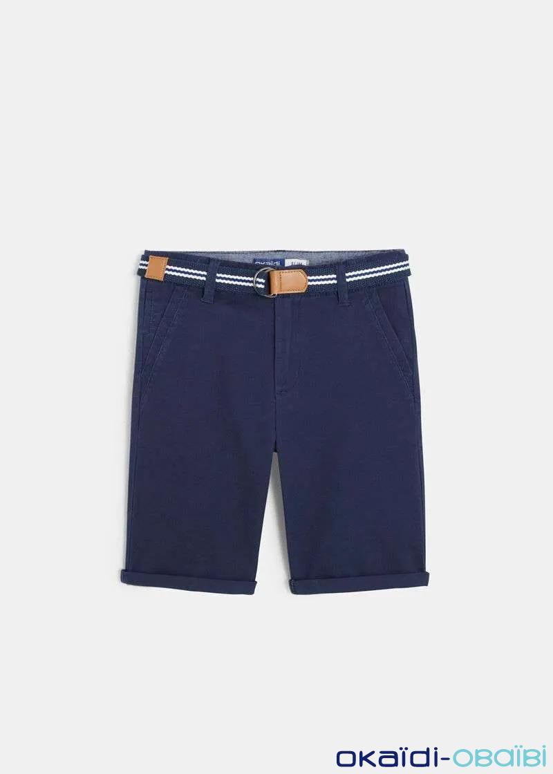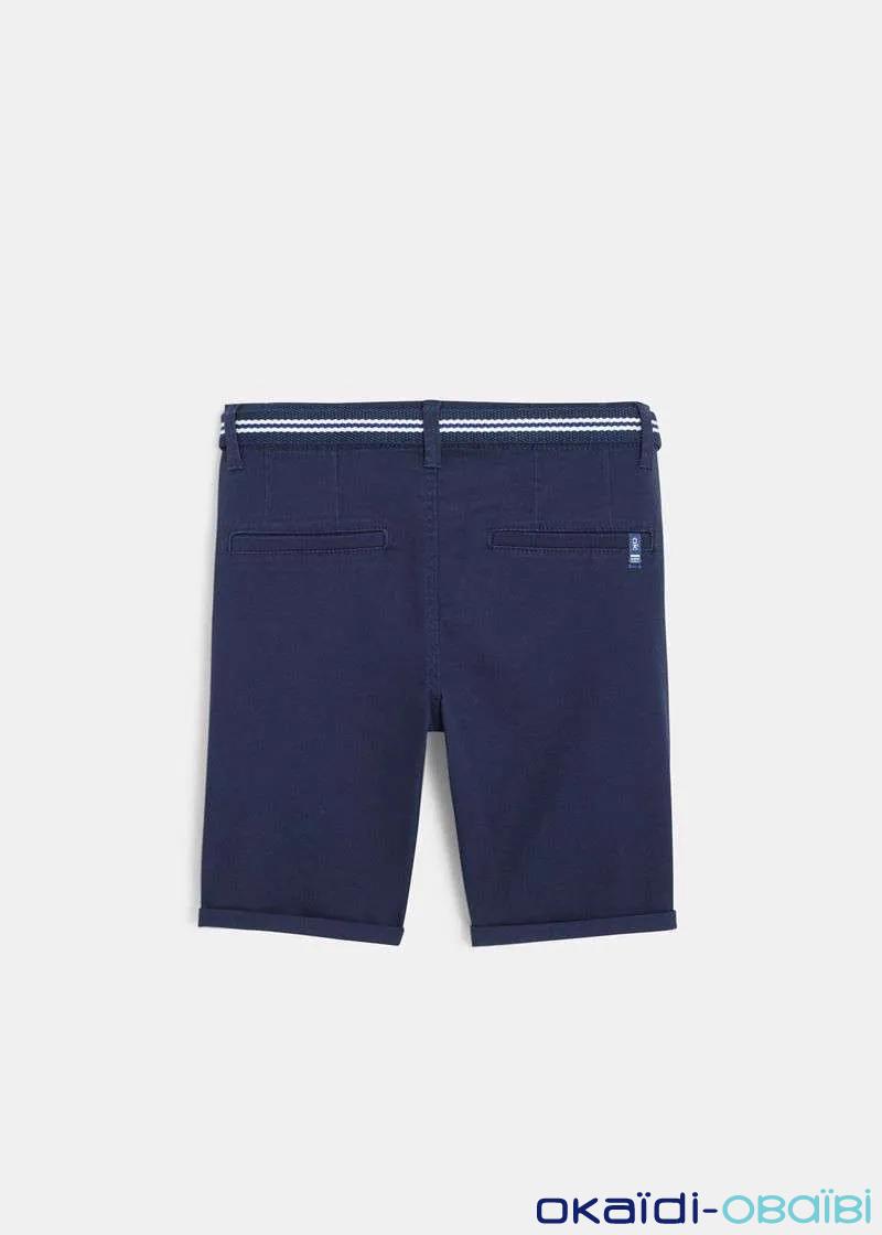 Бермуди за момчиња од малку растегливо платно со ткаен ефект. Имаат прилагодлив и отстранлив ремен. Отворање со копче и скриен патент напред. Одвнатре имаат прилагодлив појас со закопчана еластична лента.