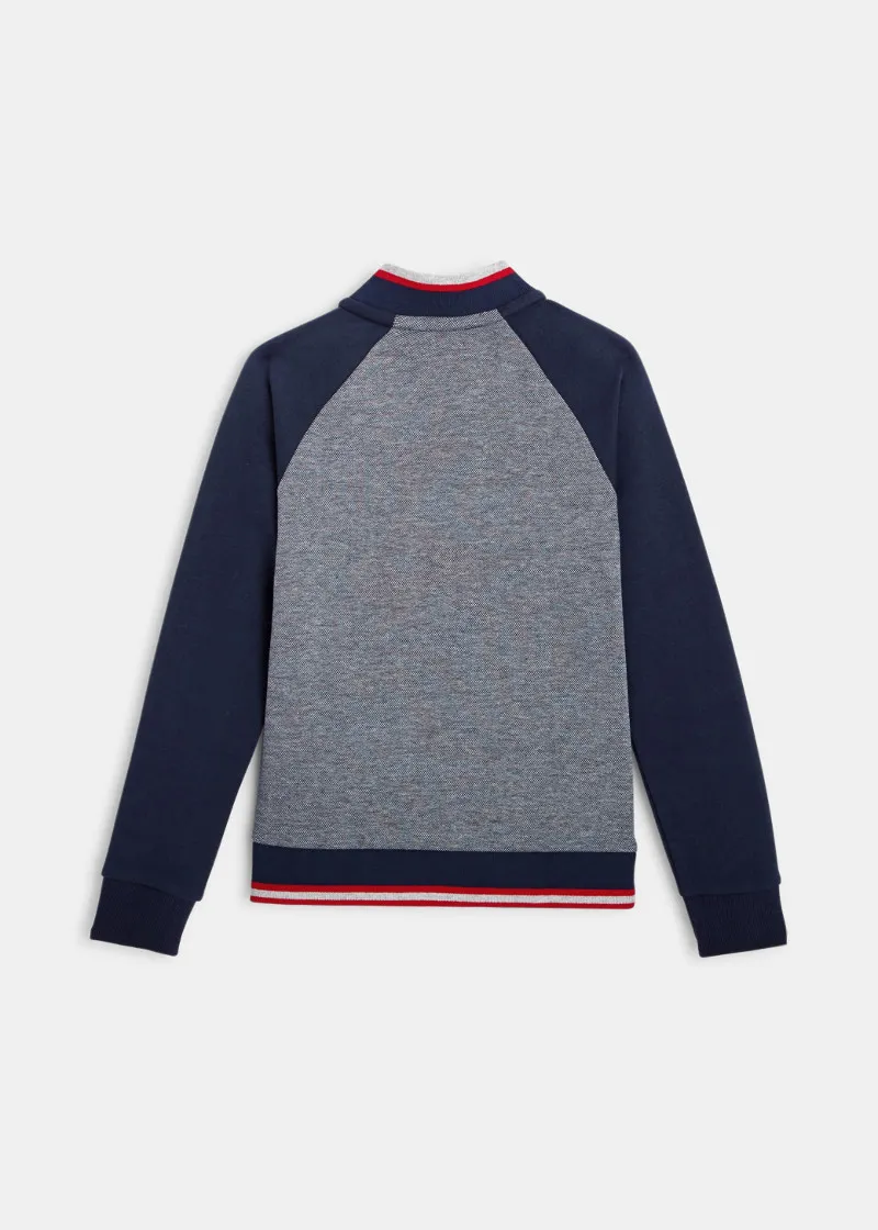 Оригинален допир! Оваа блуза со долги ракави е мешавина од една боја и пике дрес. Мотивите на градите ги евоцираат јакните од англиските униформи.