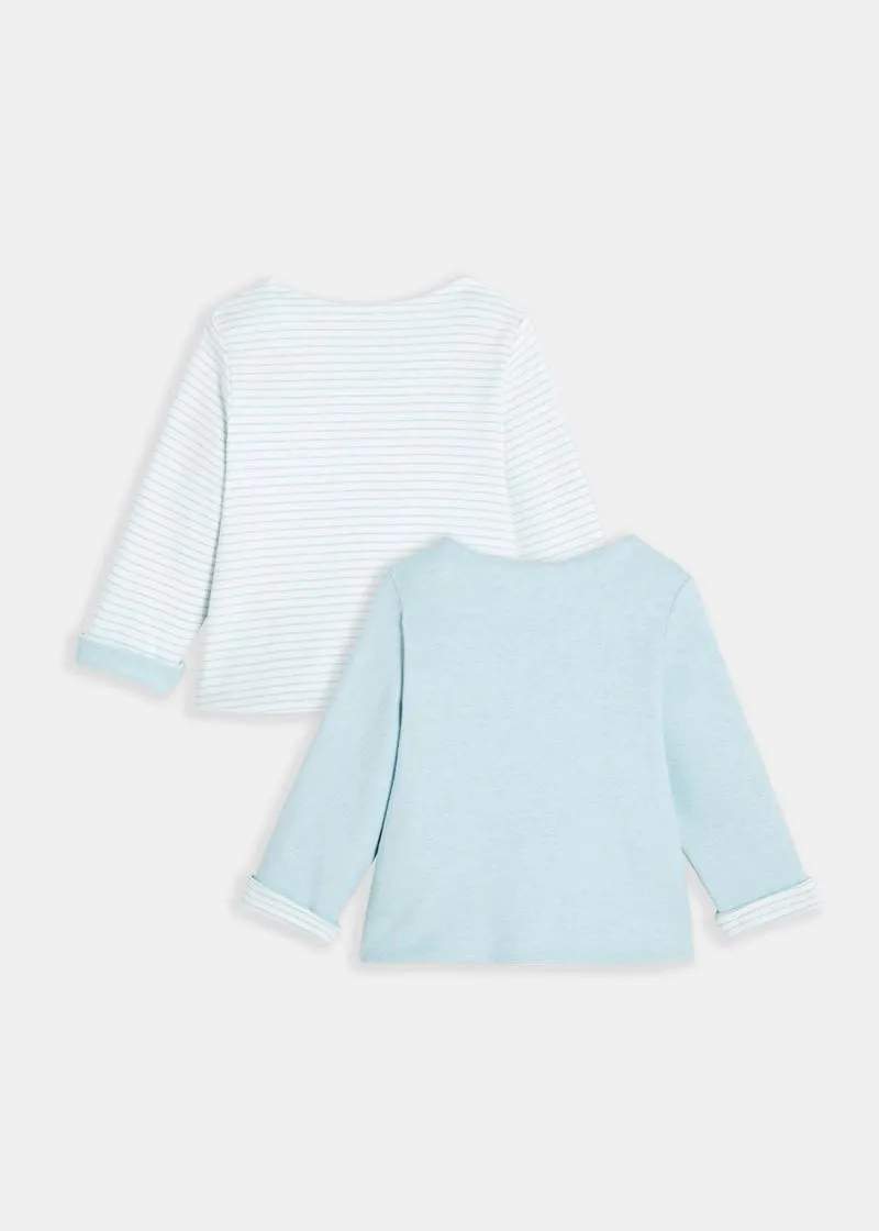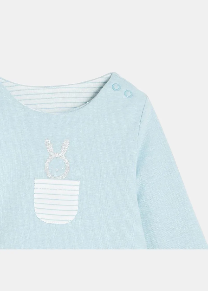 Елек за новороденчиња. Еластичен, со две лица, двослојна плетена: една шарена страна, една трендовска страна. Органски памук. Се затвара со копчиња на рамото 2x2 со преклопување. Кружно деколте. Долги ракави. Мала етикета Obaibi.