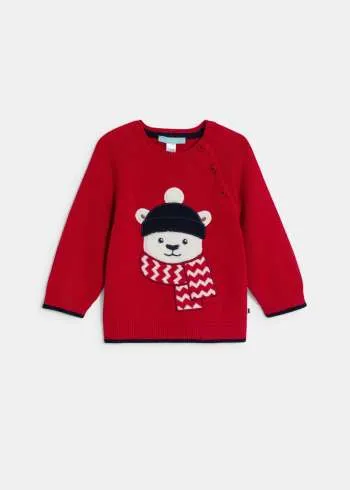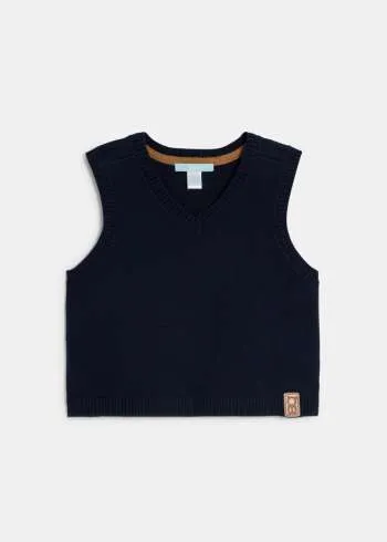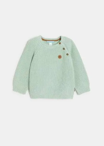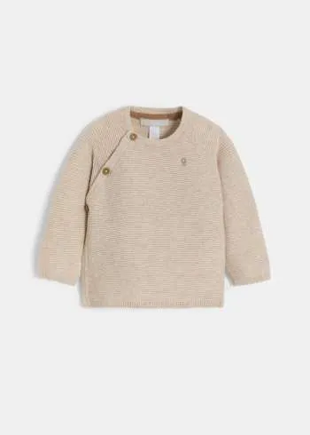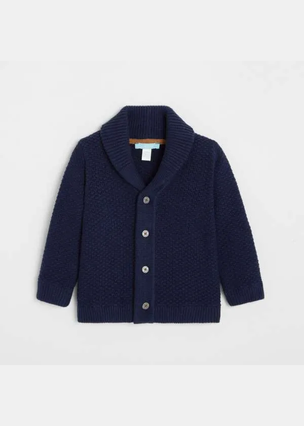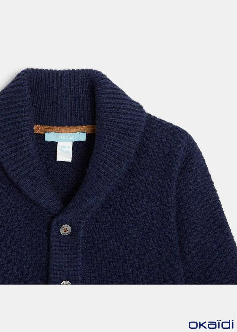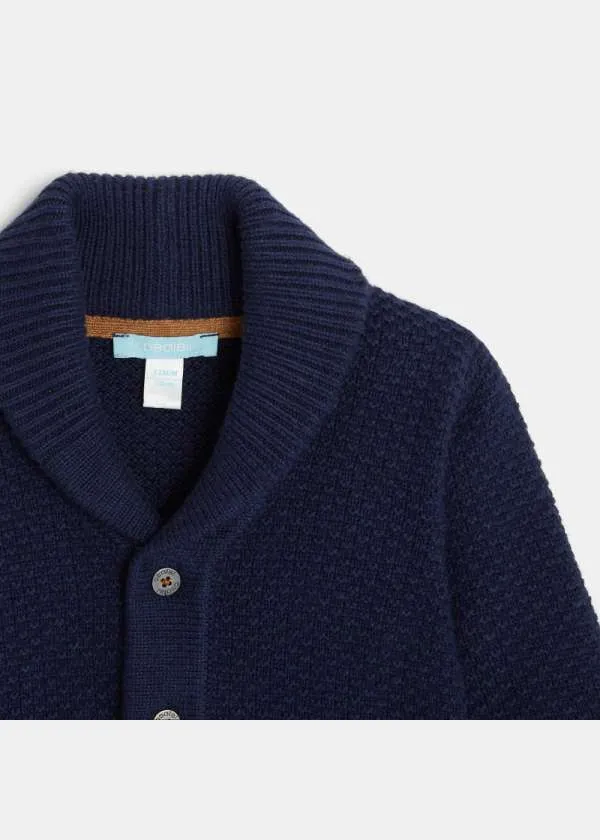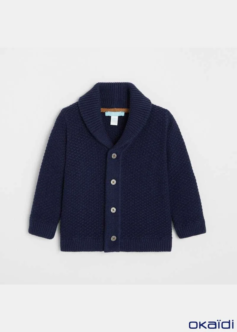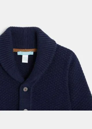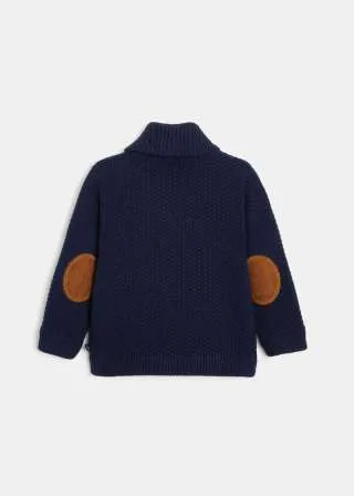 Благ ретро изглед со јака од шал и ултра-мека плетена ткаенина за овој џемпер на закопчување за момчиња. Има парчиња во боја на лактите.