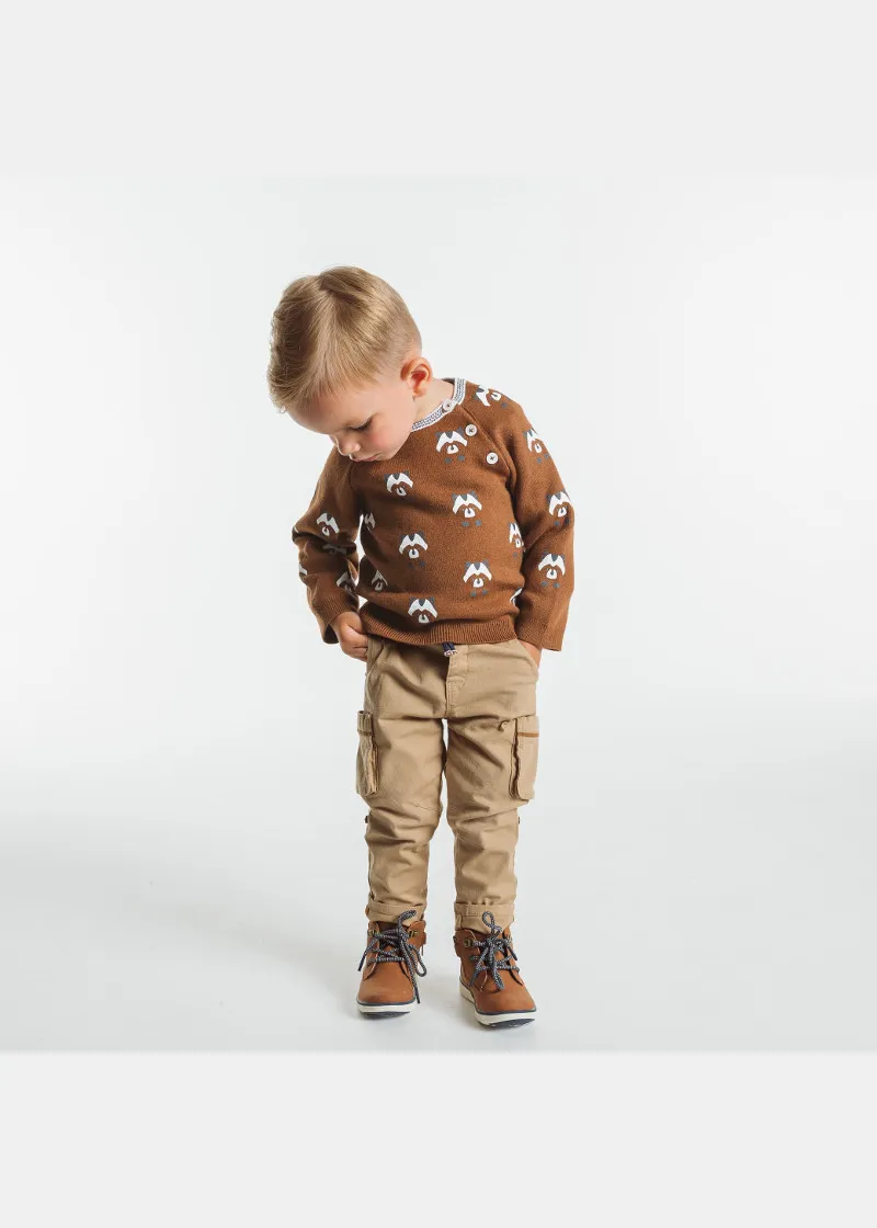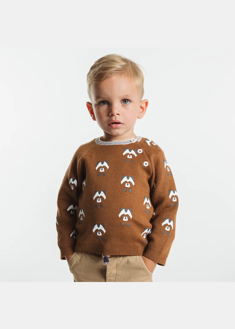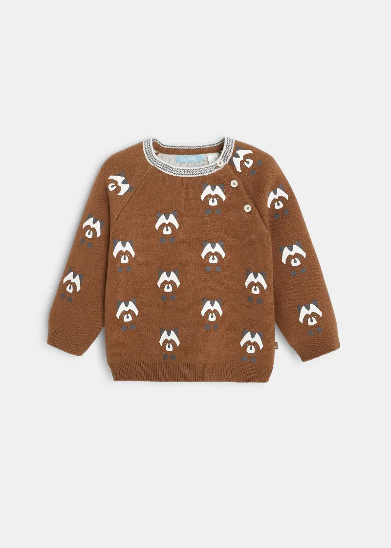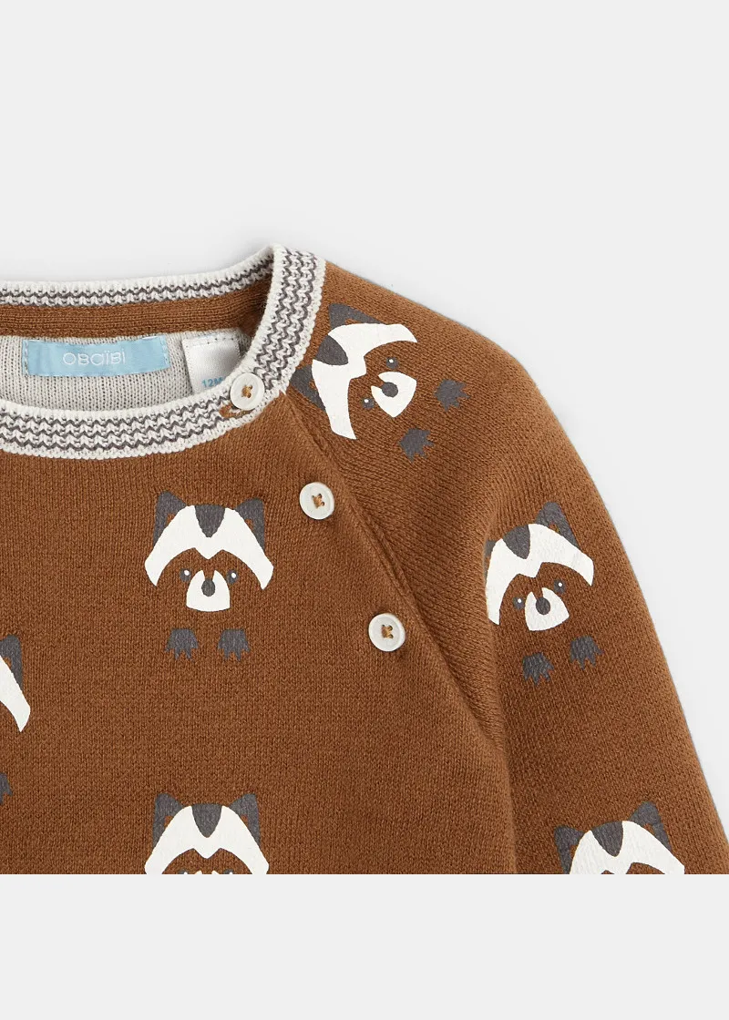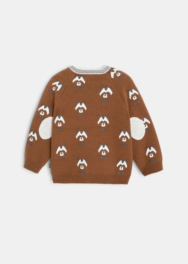 Ултра-мека двострано печатена плетена ткаенина за џемпер во стил на дуксер со графички животински отпечаток. Деколте во форма на риги со практична дупка на закопчување. Парчиња на лактот во боја.