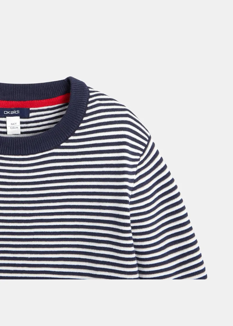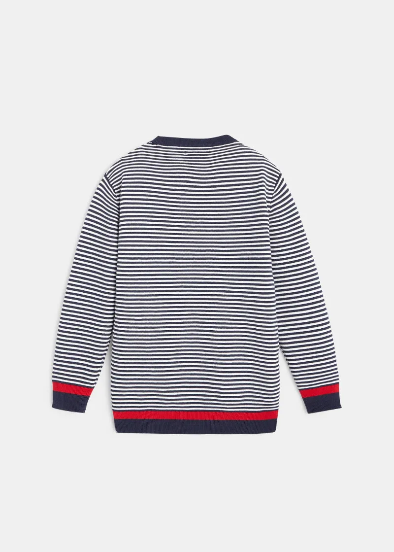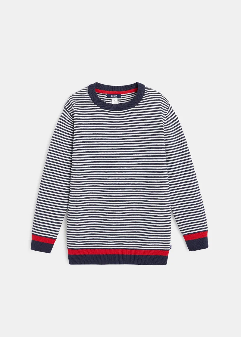 Овој морнарски џемпер има двобојни текстурирани ленти и рабови со црвена лента за сите млади морнари. Кежуал џемпер со кружна јака.
