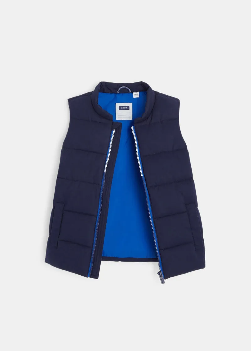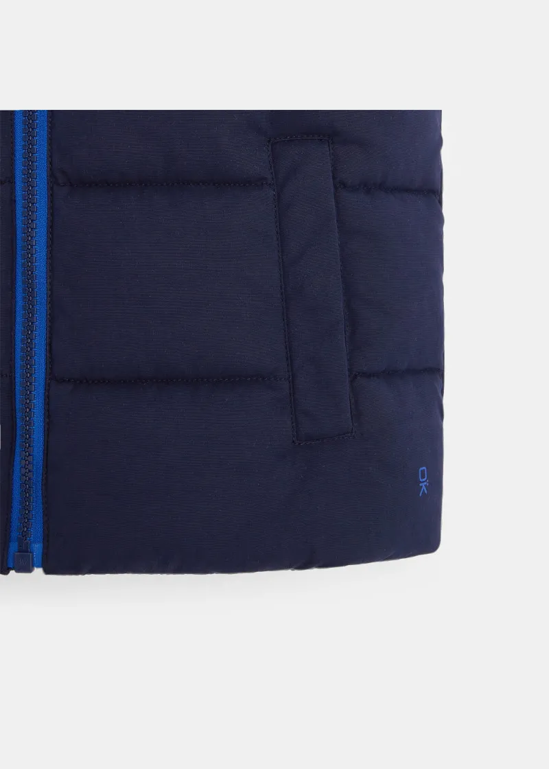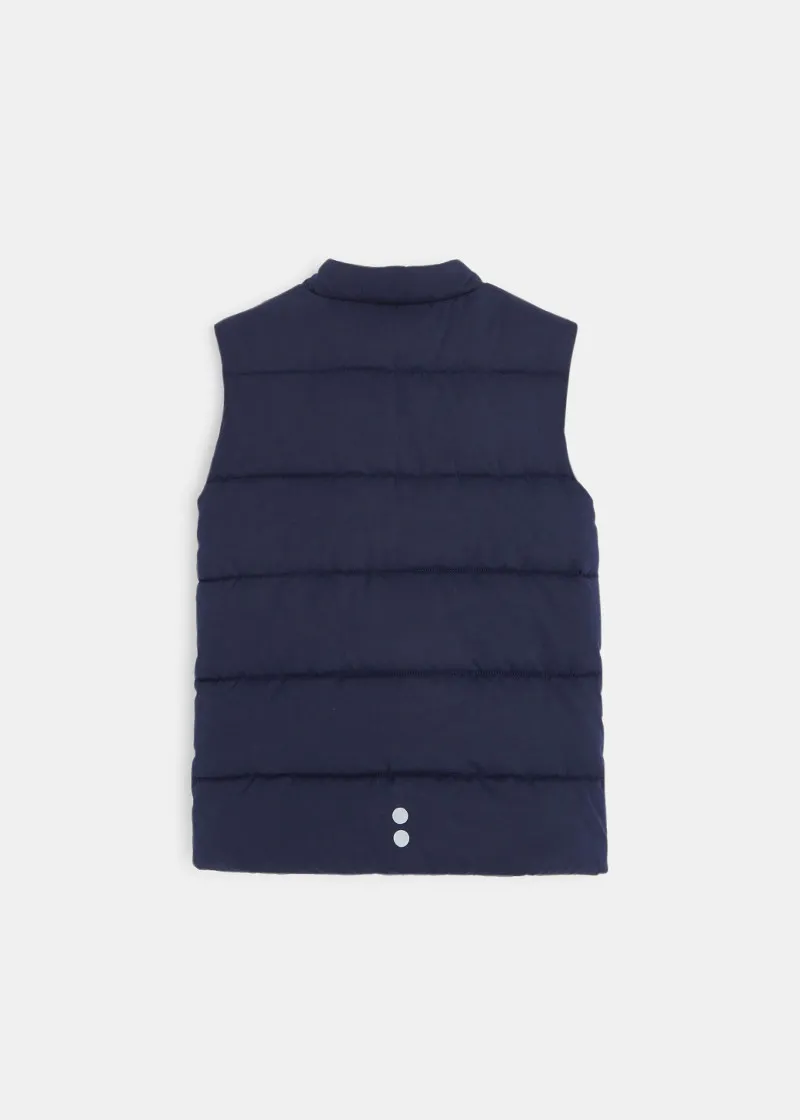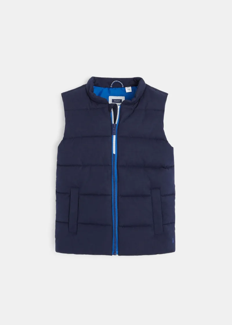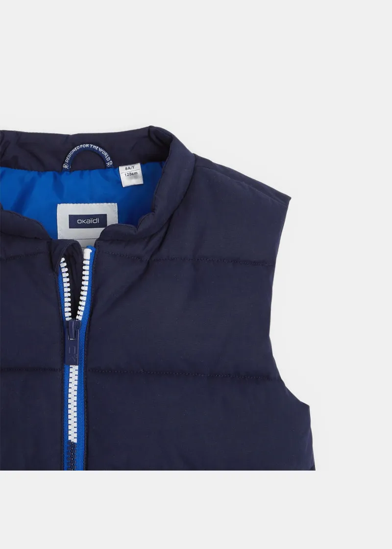 Ултра-практична за средината на сезоната или за зимски активности на отворено, оваа јакна без ракави има разнобоен патент што одговара на поставата за секојдневен изглед. Два џебови со петлици.