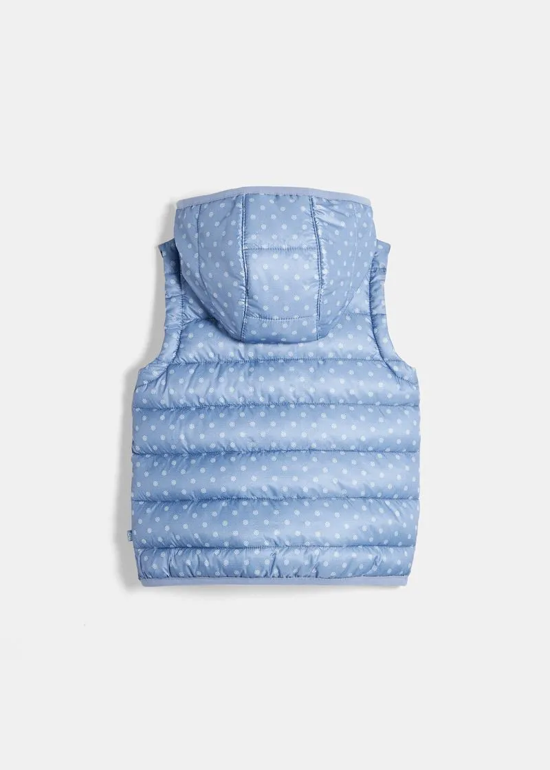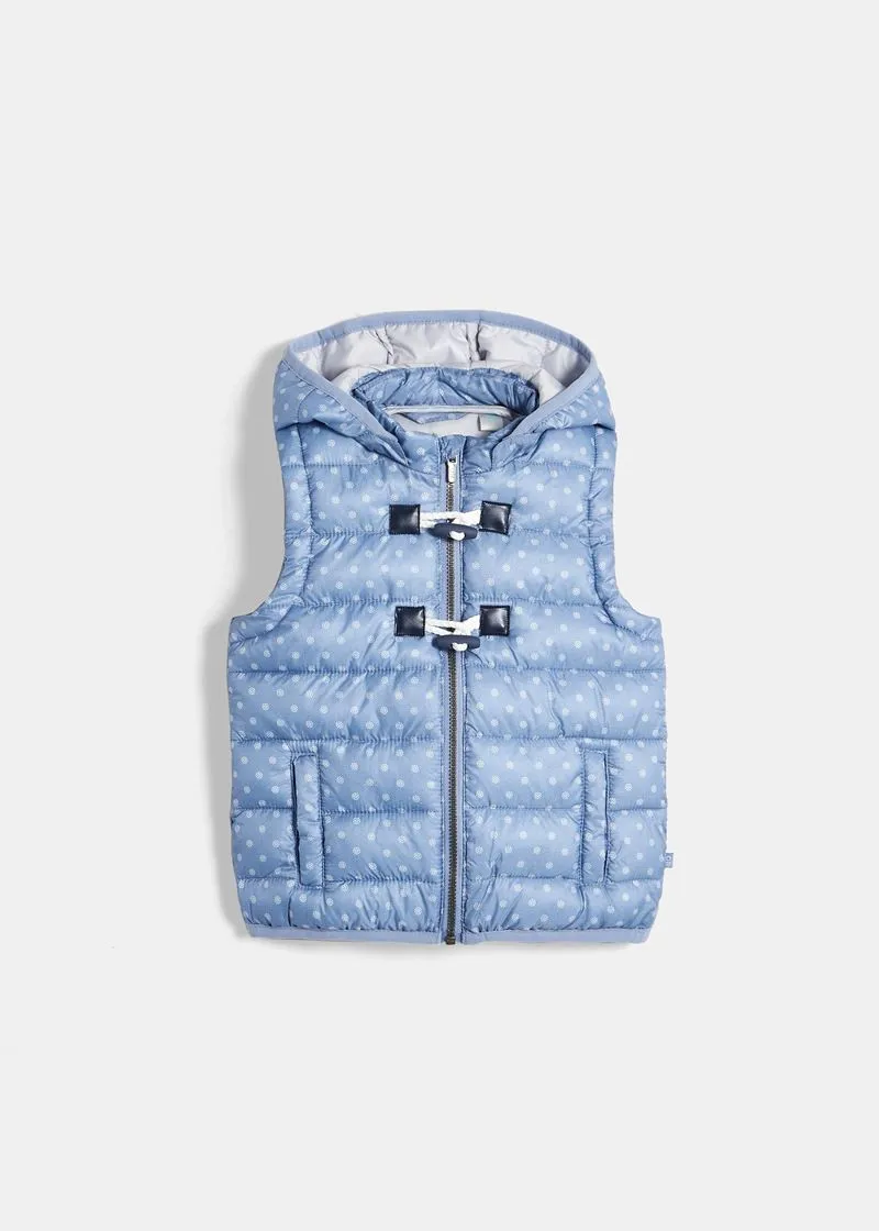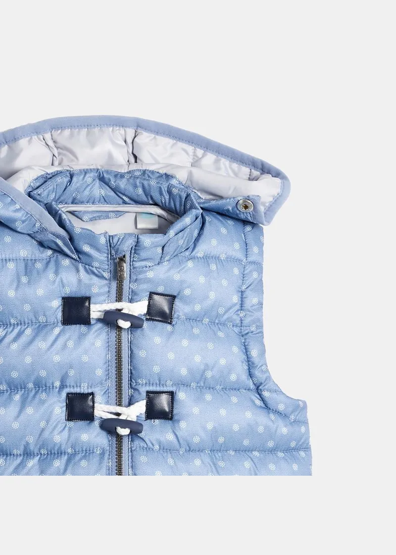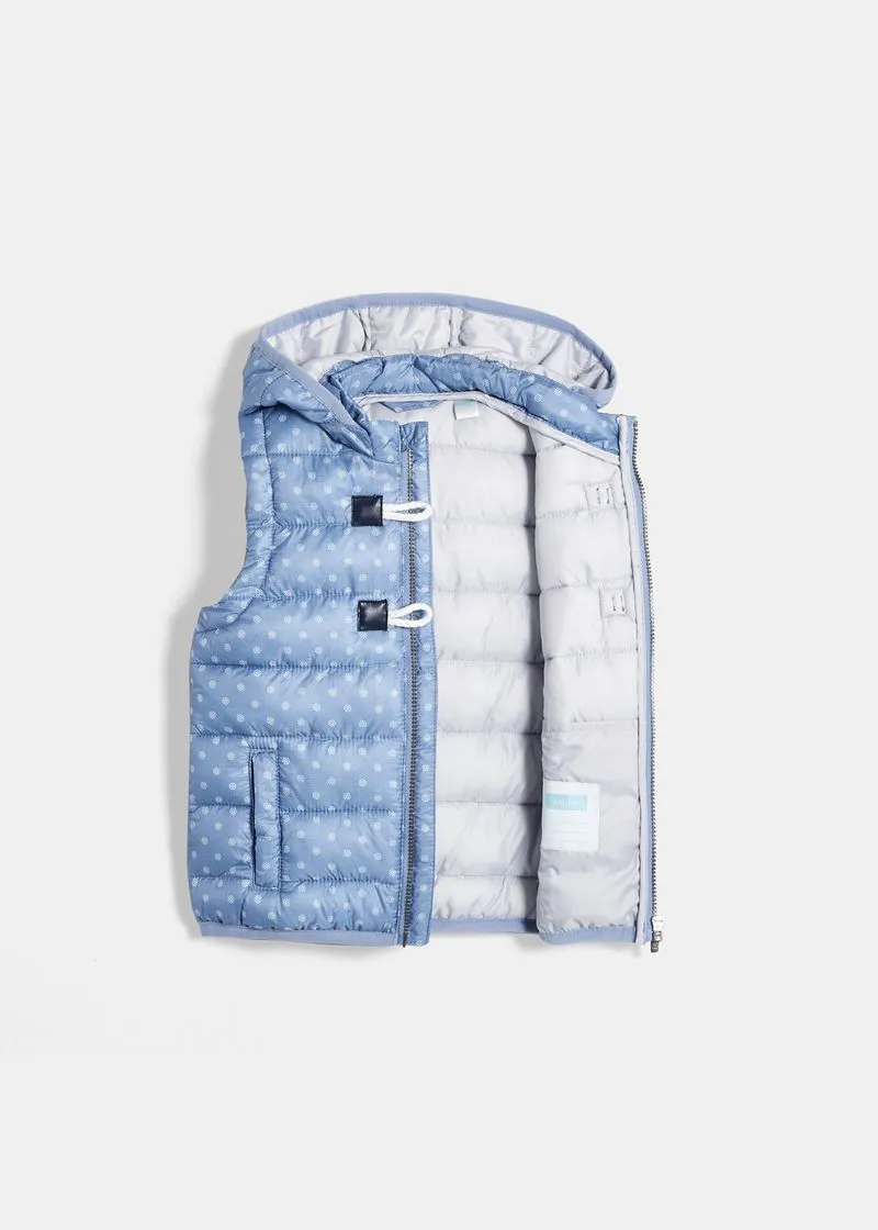 Полнет водоотпорен елек за бебе. ЕКОЛОШКО: Полнење изработено од рециклиран полиестер од пластични шишиња, што е исто толку топло како и класичното полнење. ТОПЛО: Тестирано за заштита од ладно време. ПРАКТИЧНО: се пере во машина.