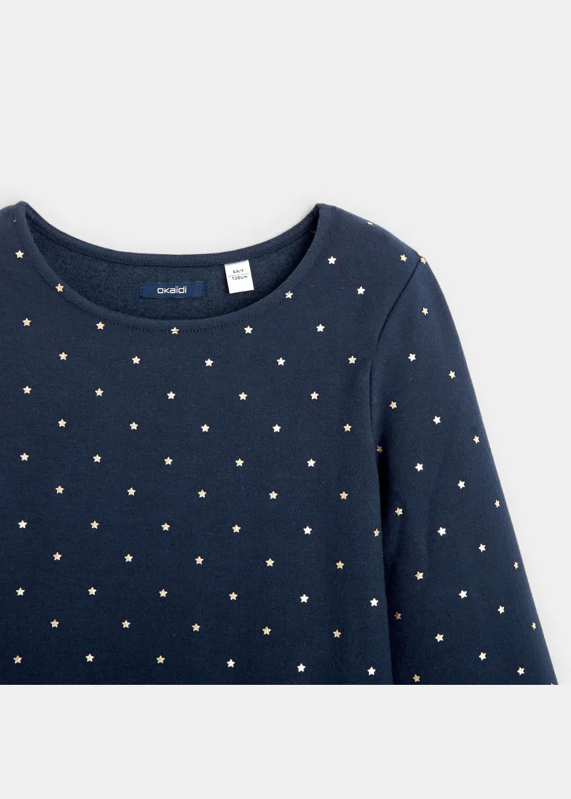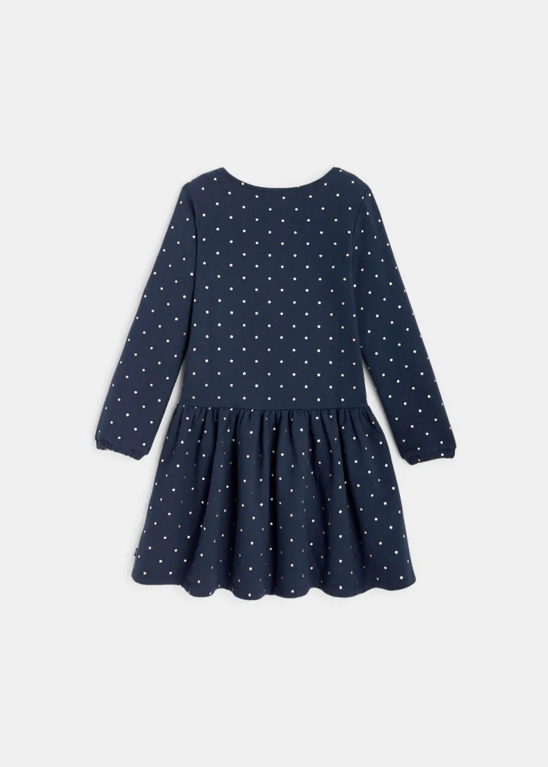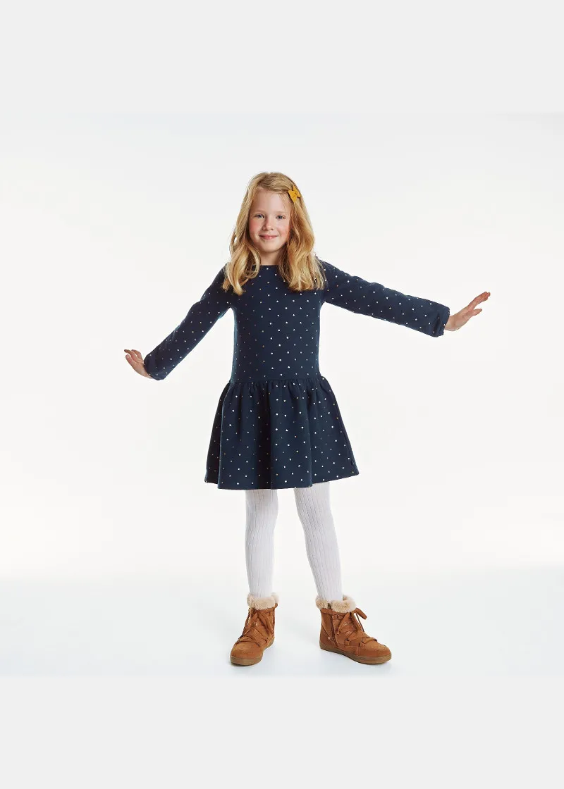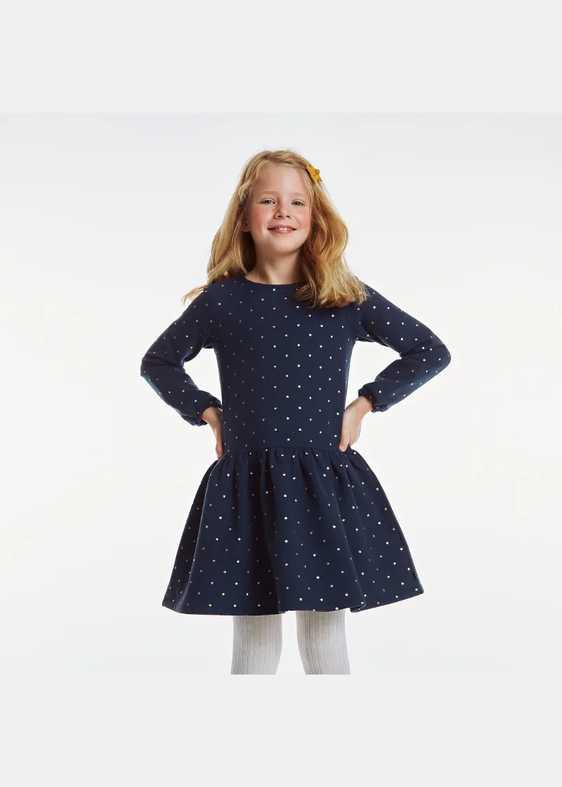 На мека и топла плетена ткаенина од руно, sвездите дискретно заземаат централно место на овој фустан со долги ракави за девојчиња. Има низок струк за секојдневен урбан изглед.