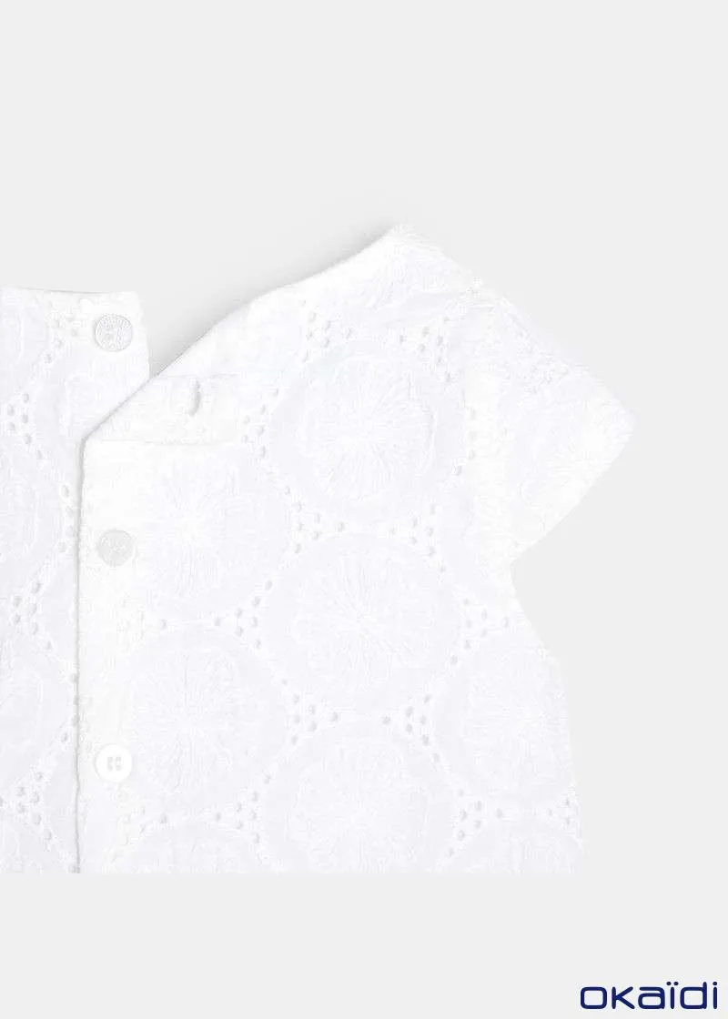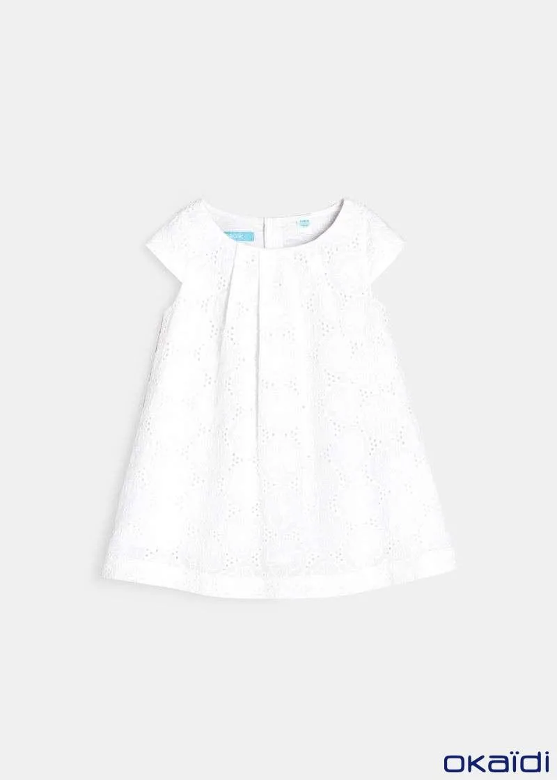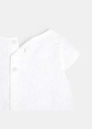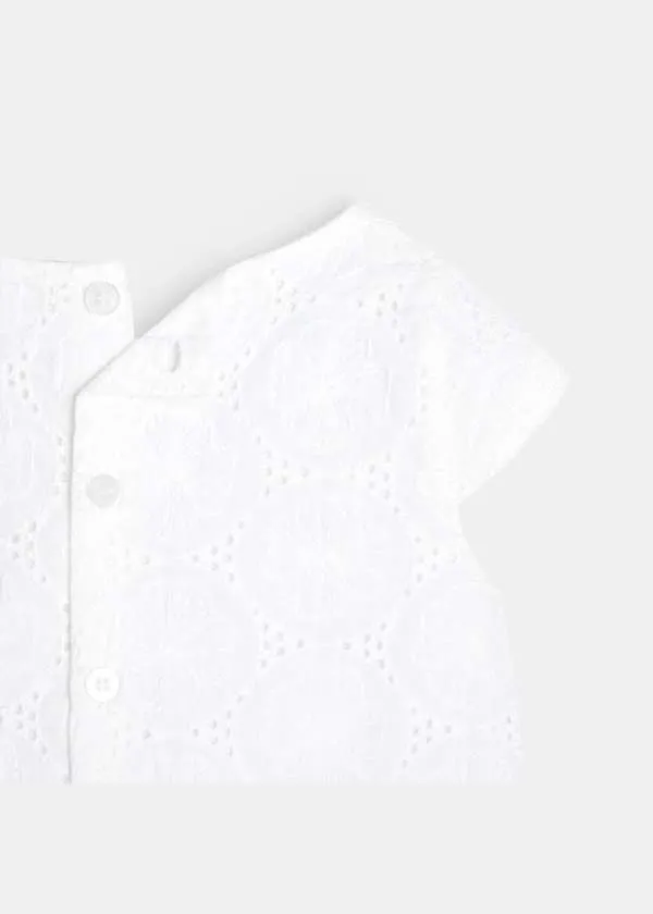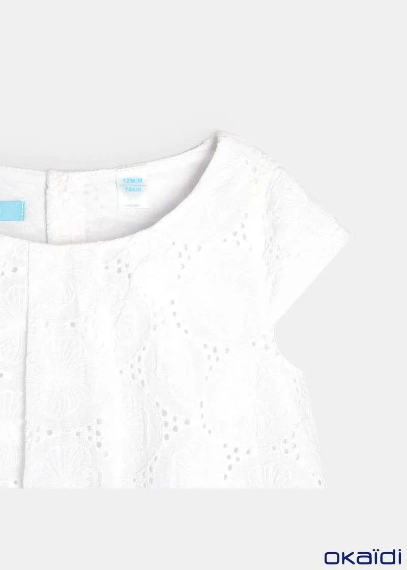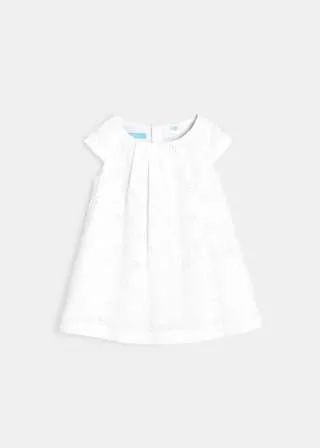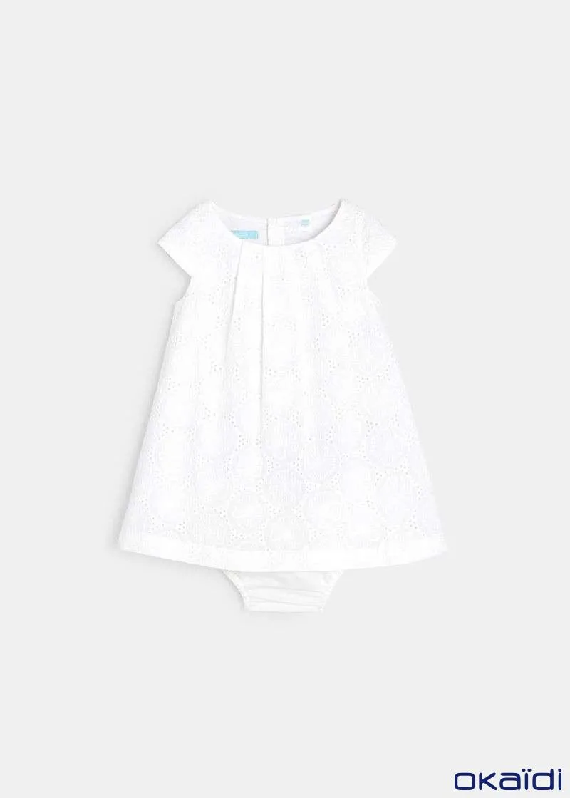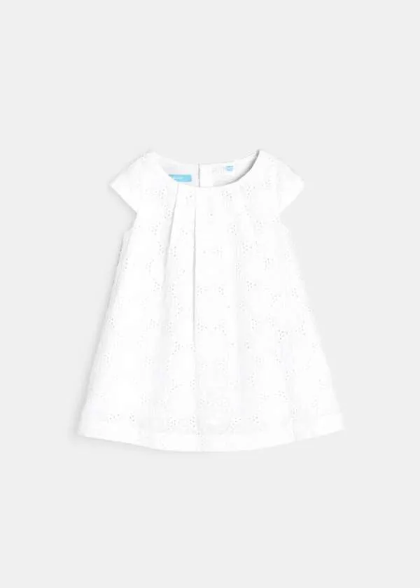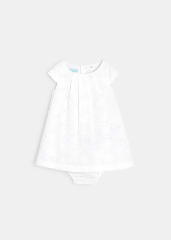 Елегантен фустан без ракави за женски бебиња. Вез со рафинирани отвори со памучна постава. Плисирано кружно деколте. Целосно закопчување од назад за лесно облекување. Ракави со прорези на рамената. Гаќички од поплин што ги прикриваат пелените.