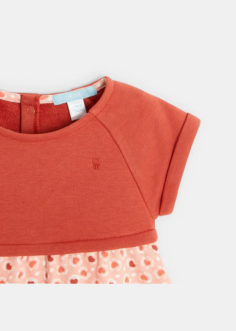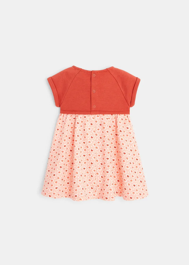 Ултра-мек фустан со ефект 2 во 1, посеан со срца во есенски бои. Кратки ракави со свиткување и практично деколте со прицврстен грб.