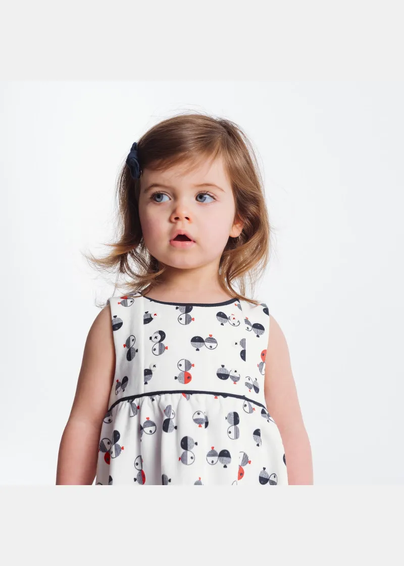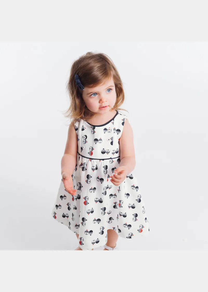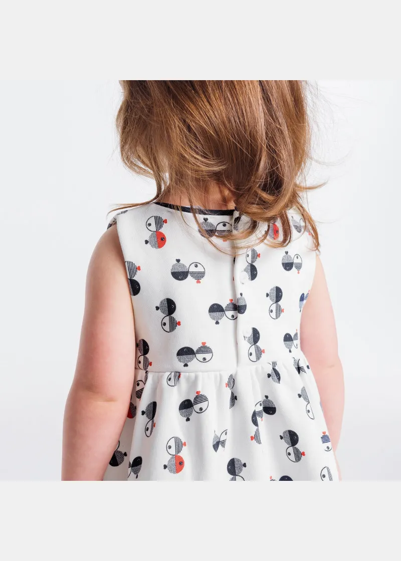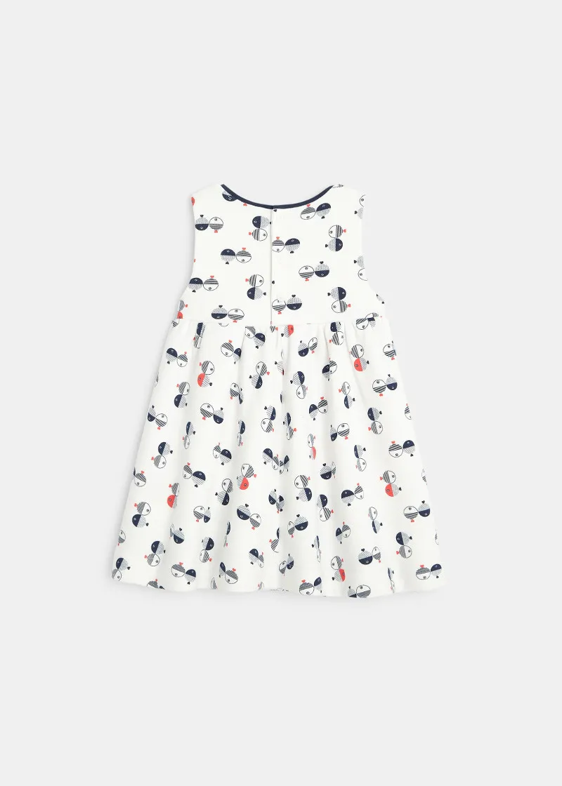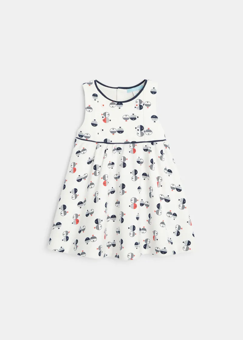 Овој фустан е совршен за викенди на море или за трендовски секојдневни комбинации. Фустан без ракави, изработен од мек материјал и со стилизиран принт на риба. Широко здолниште,деколте со копче од задната страна за лесно облекување.