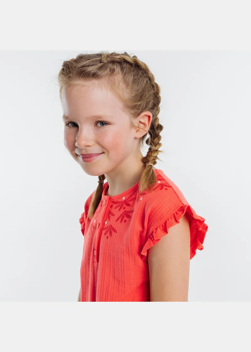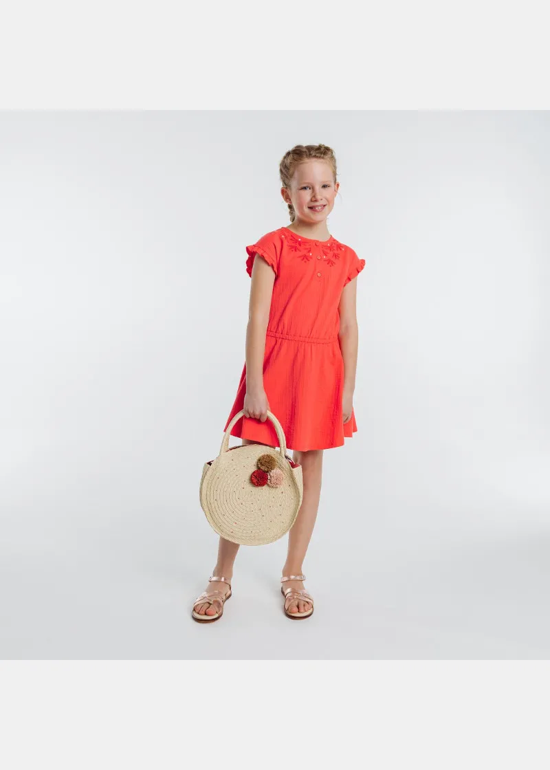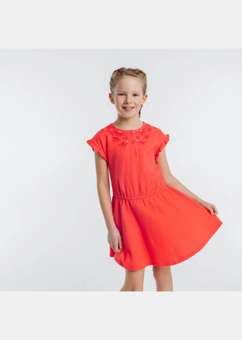 Љубов на прв поглед: девојчињата го обожуваат овој мек фустан кој е удобен за носење и има многу детали: кратки ракави со набори, уникатен вез околу вратот, копчиња за лесно облекување и еластична лента на струкот.