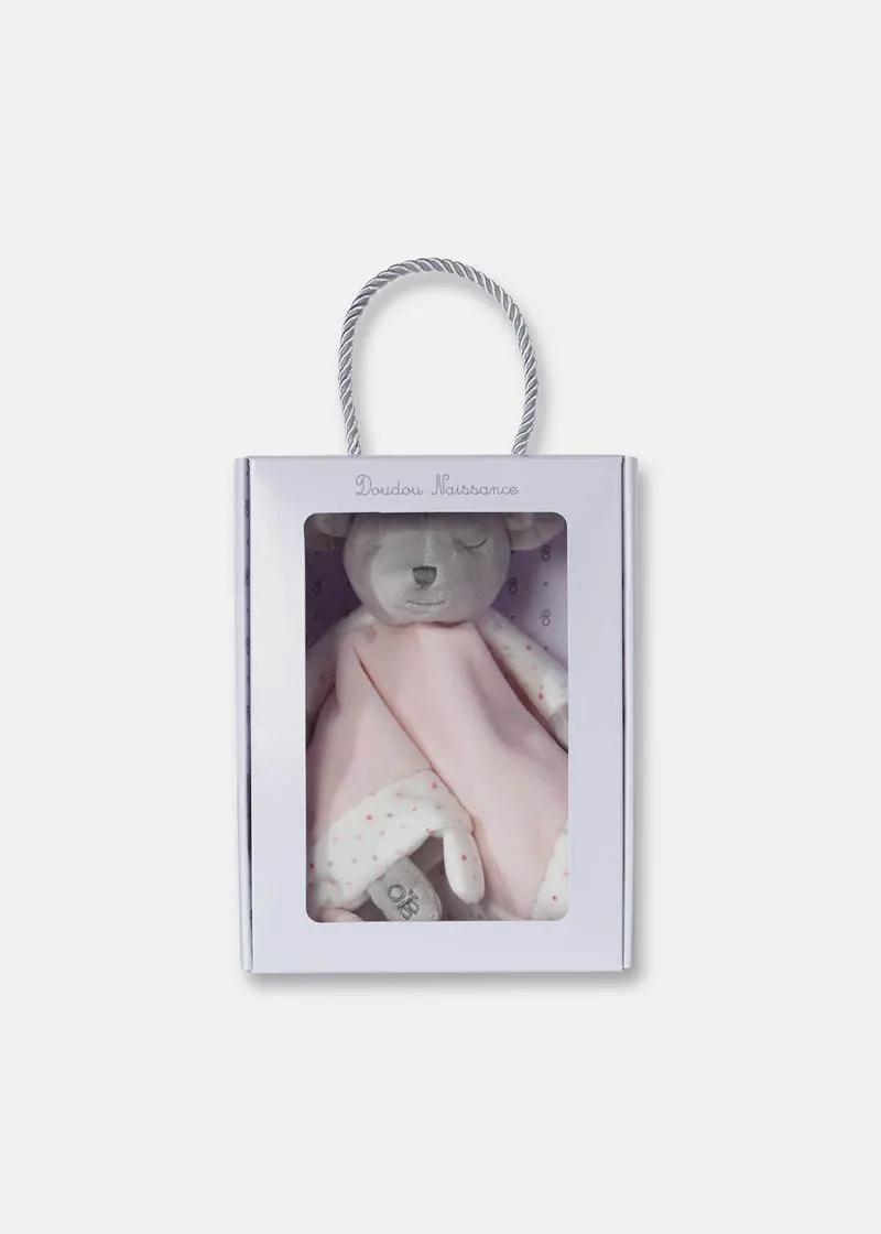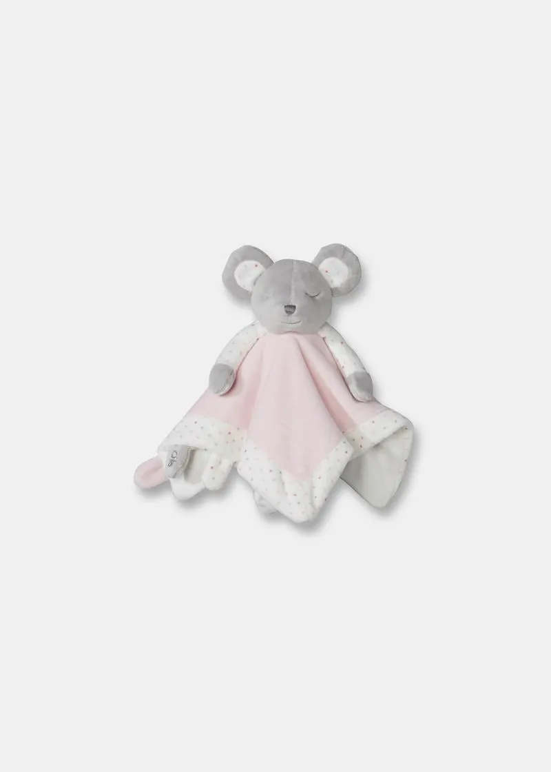 Плишана играчка за девојчиња со глава на глувчето и извезени детали за безбедноста на бебето. Има дупка на прстите под главата за да може да се користи како кукла. Големина прибл.26x26см. Се продава во кутија за подароци.