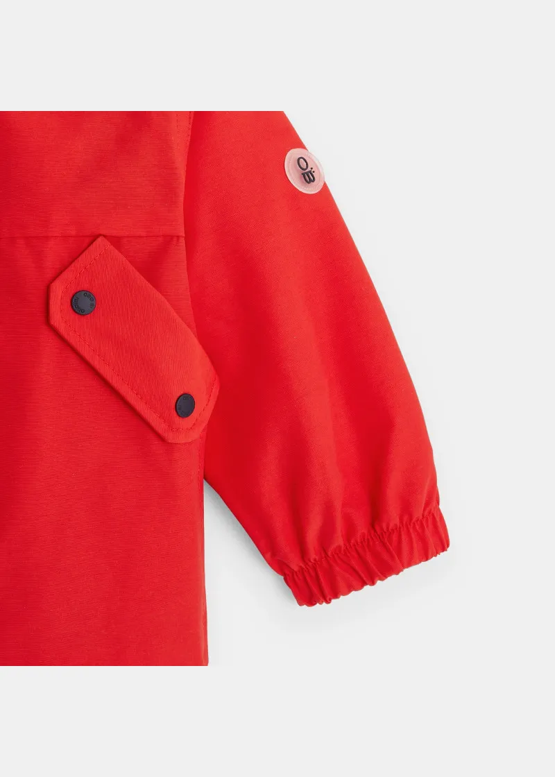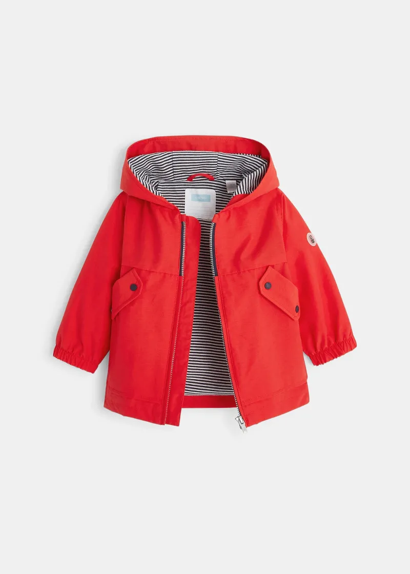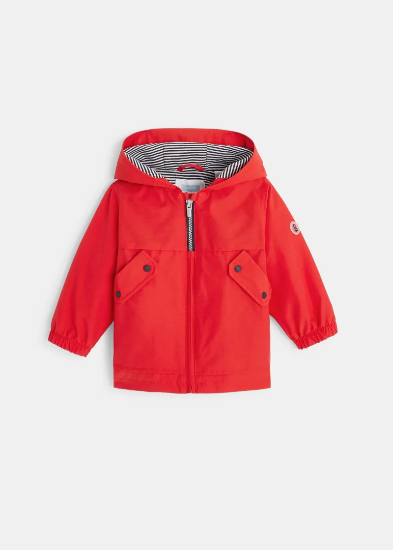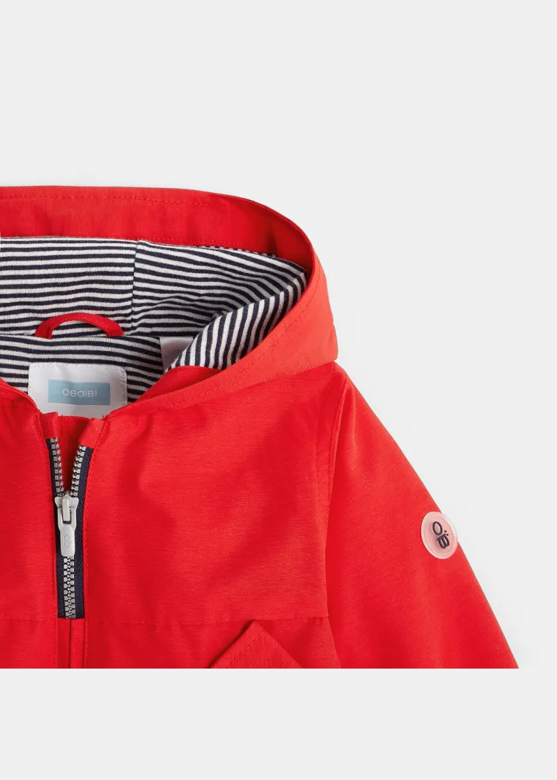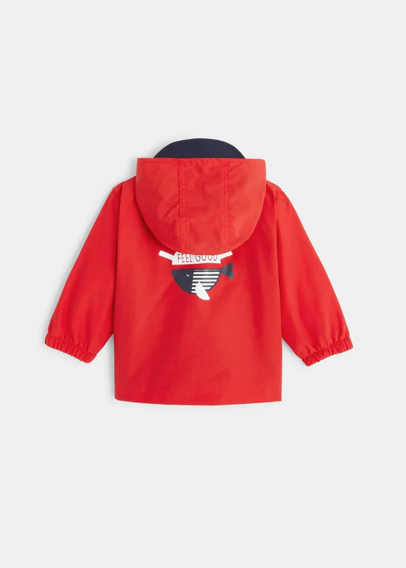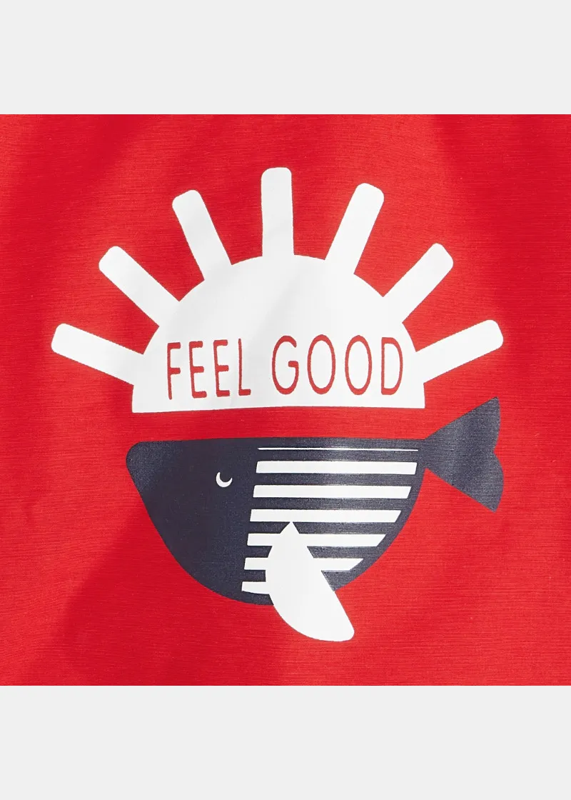 Како риба во вода,поточно на дожд со оваа лесна и шарена јакна направена со платно што го не пропушта вода. Овој мантил има морнарски изглед , копчиња и еластични манжетни. 2 џеба. Печатен мотив назад.