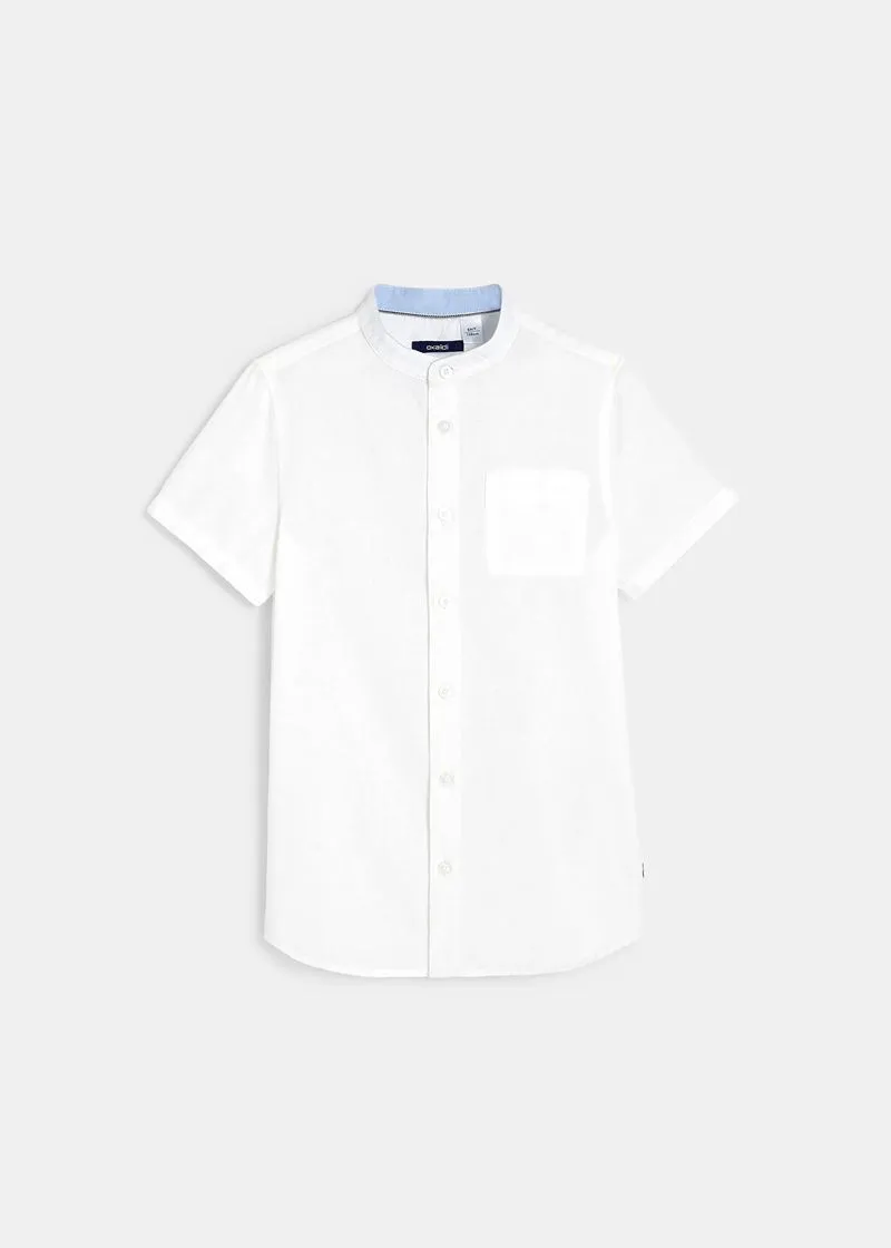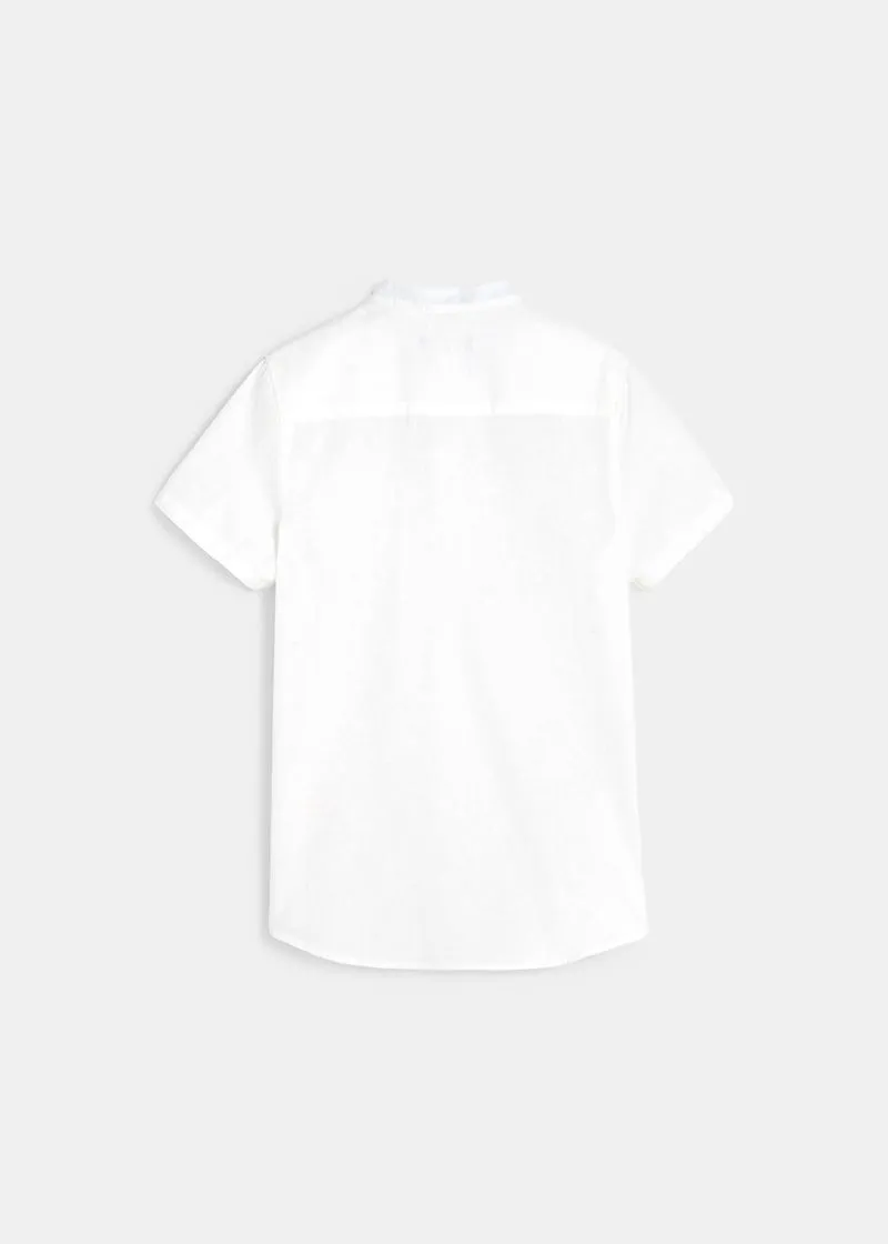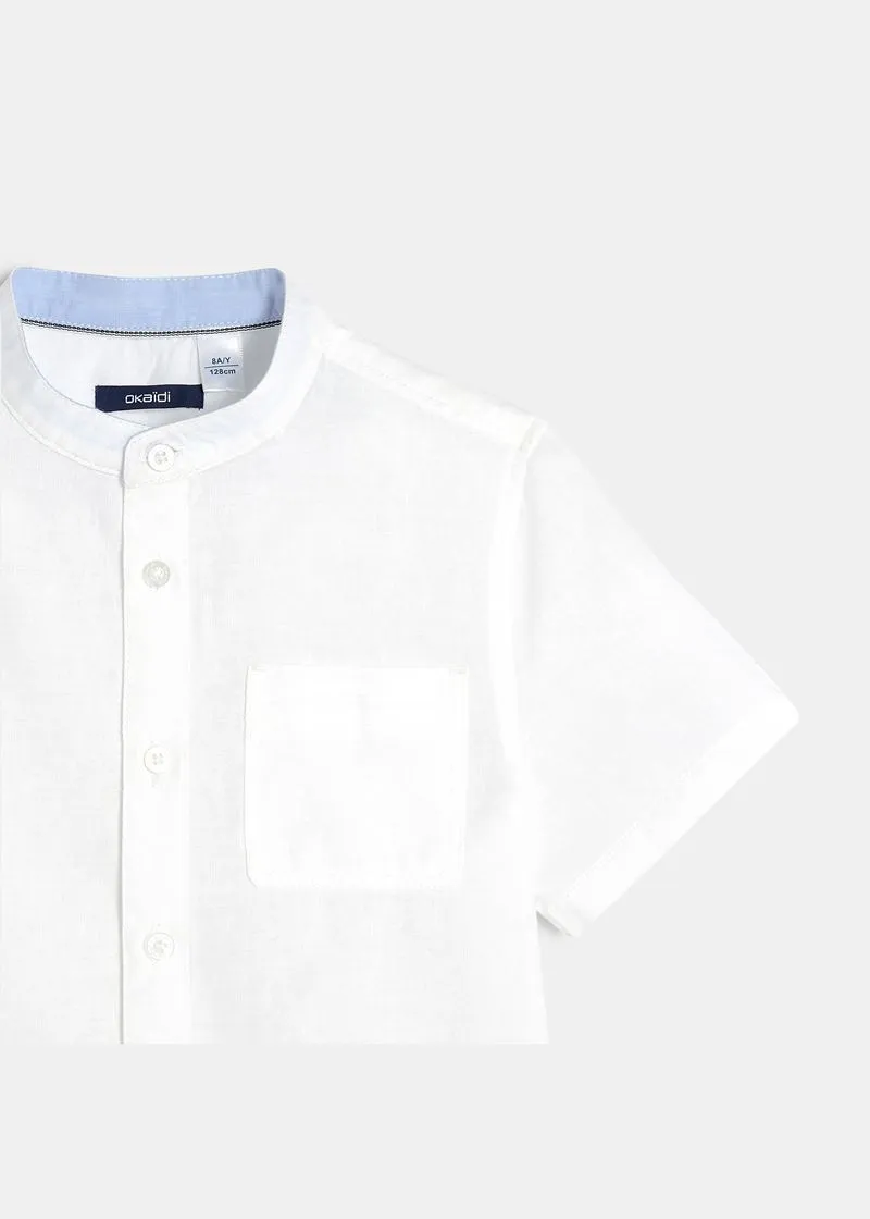 Стрејт фит кошула за момчиња од памучен поплин и лен, со ткаен ефект. Има мандаринска јака, копчиња по целата должина и 1 џеб на градите.