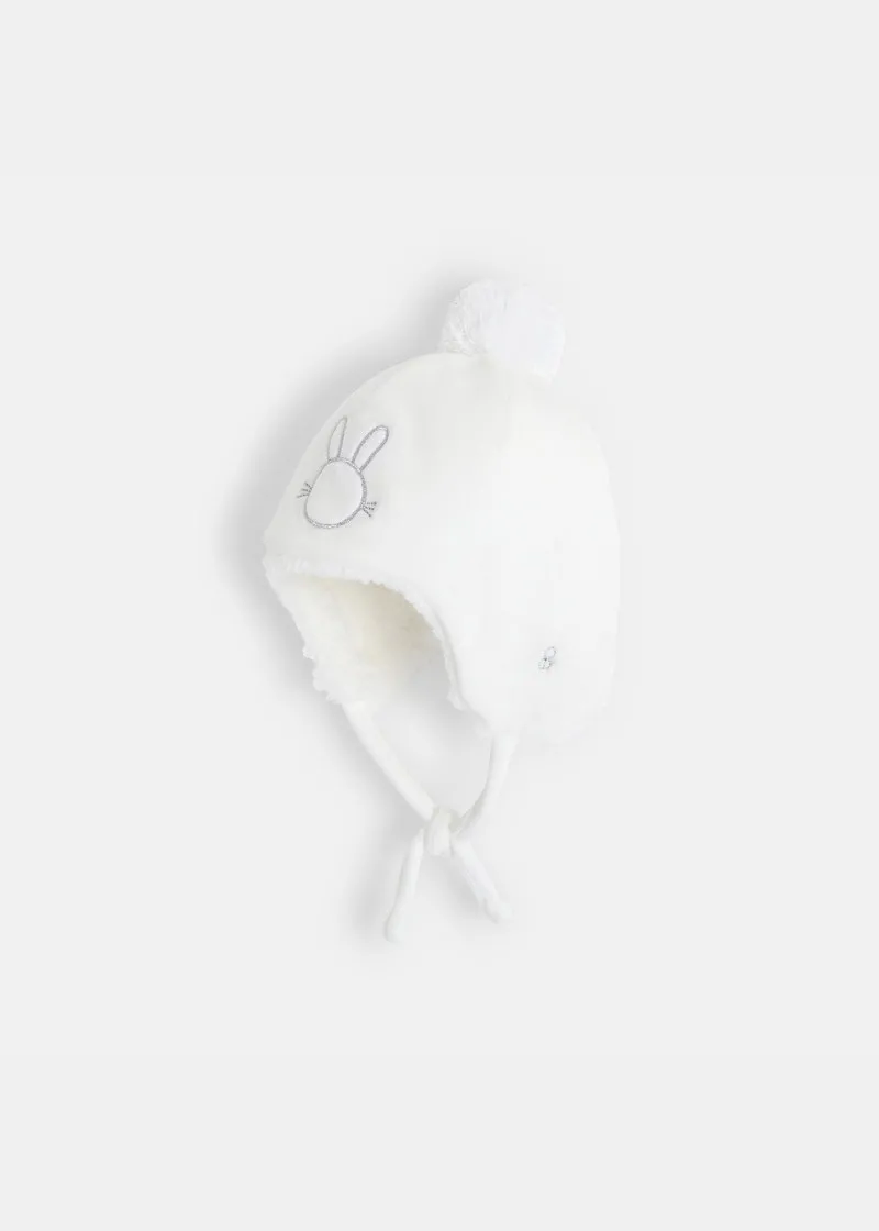 Симпатичен зајак во металик везови, поларно руно чуло со топче за мали девојчиња кое загрева. Поставено со мека боа и прицврстенo со врвки за врзување. Може да се комбинира и со други пријатни додатоци од колекцијата Obaibi.