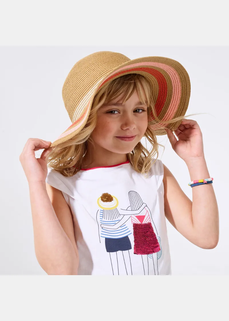 Нека дојдат првите сончеви денови за да можеме да ја носиме оваа впечатлива сламена шапка. Со колоритни ленти, одговара со секој стајлинг на девојчињата.