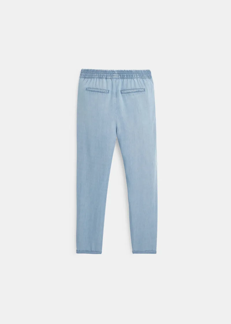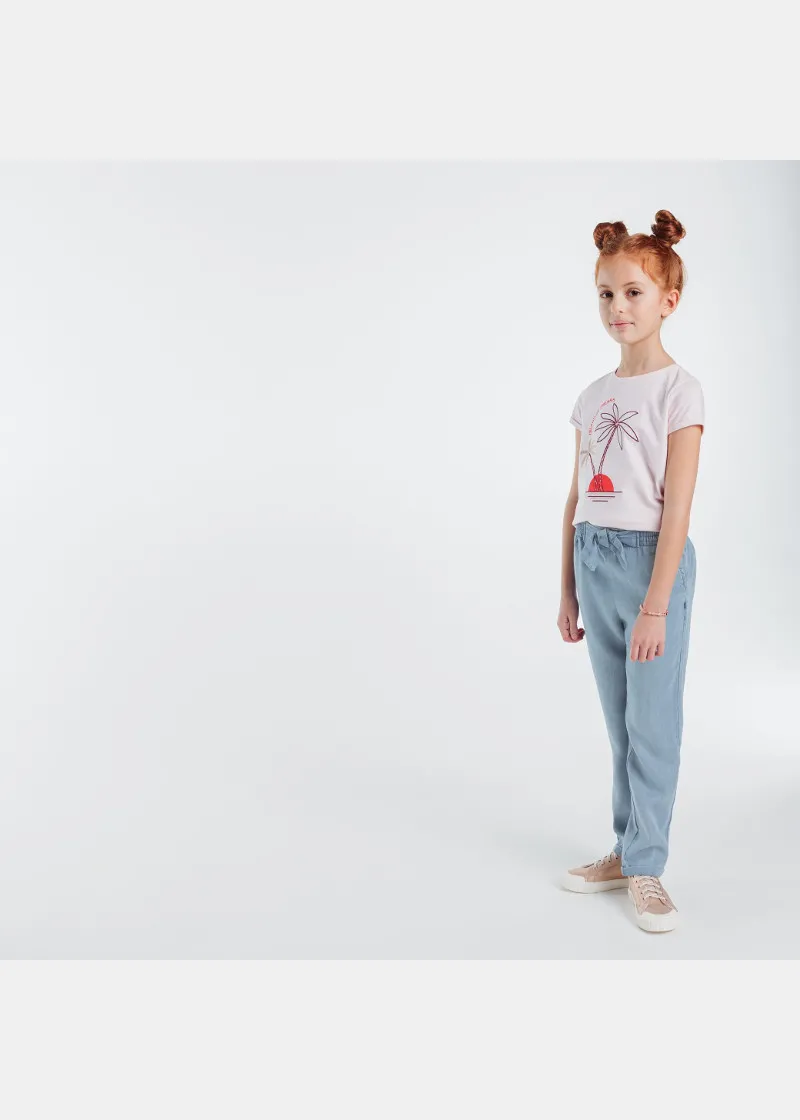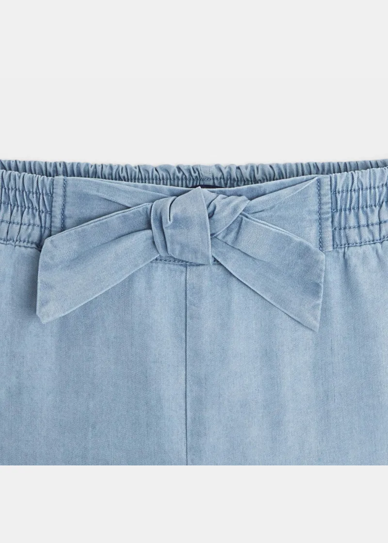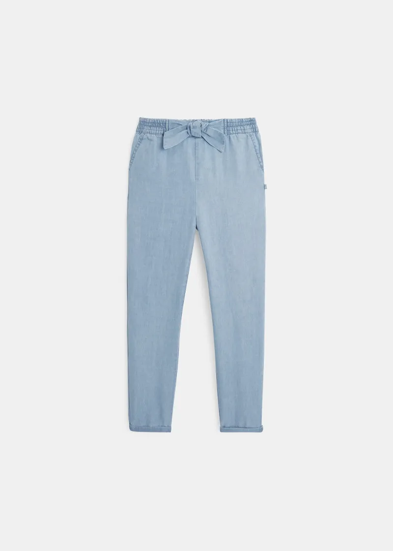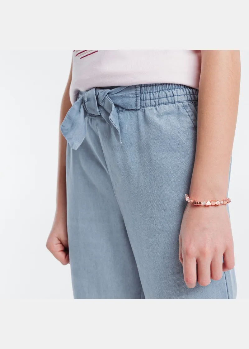 Широки панталони налик на фармерки, но исклучително удобни. Голема панделка на средината за уште постилски изглед.