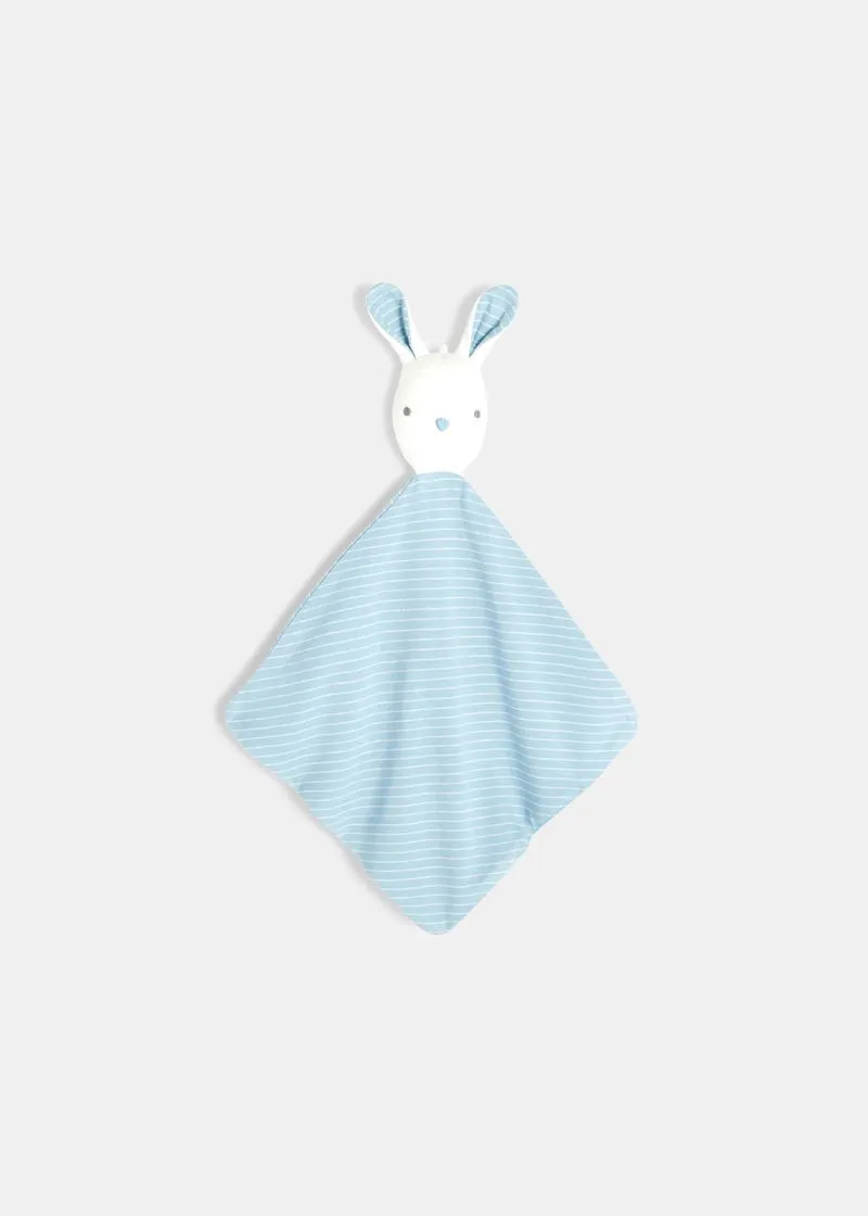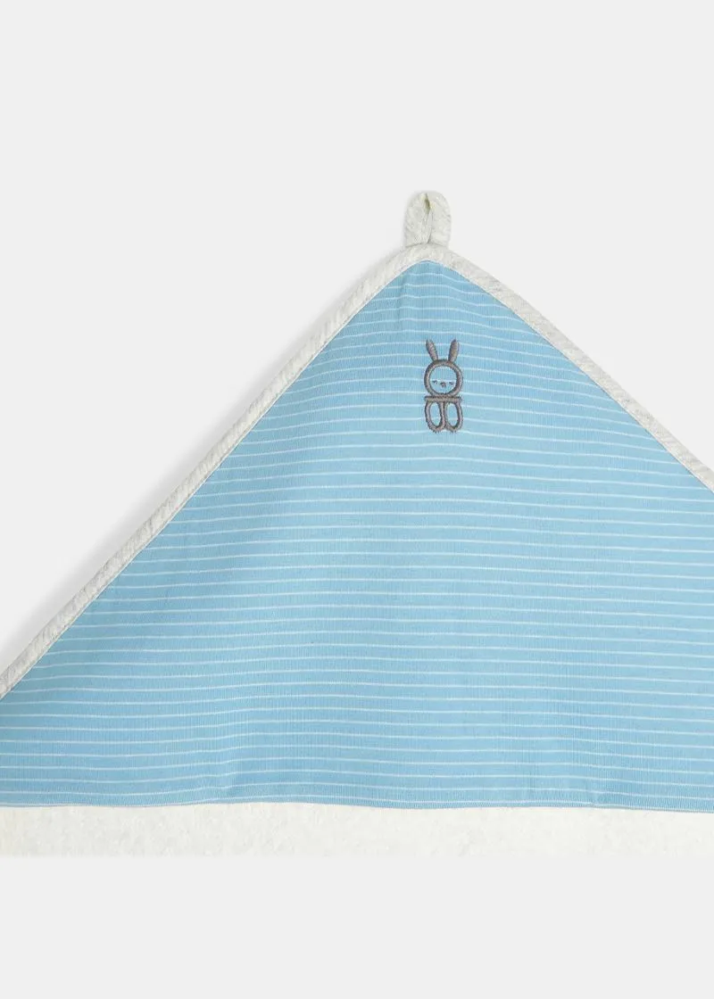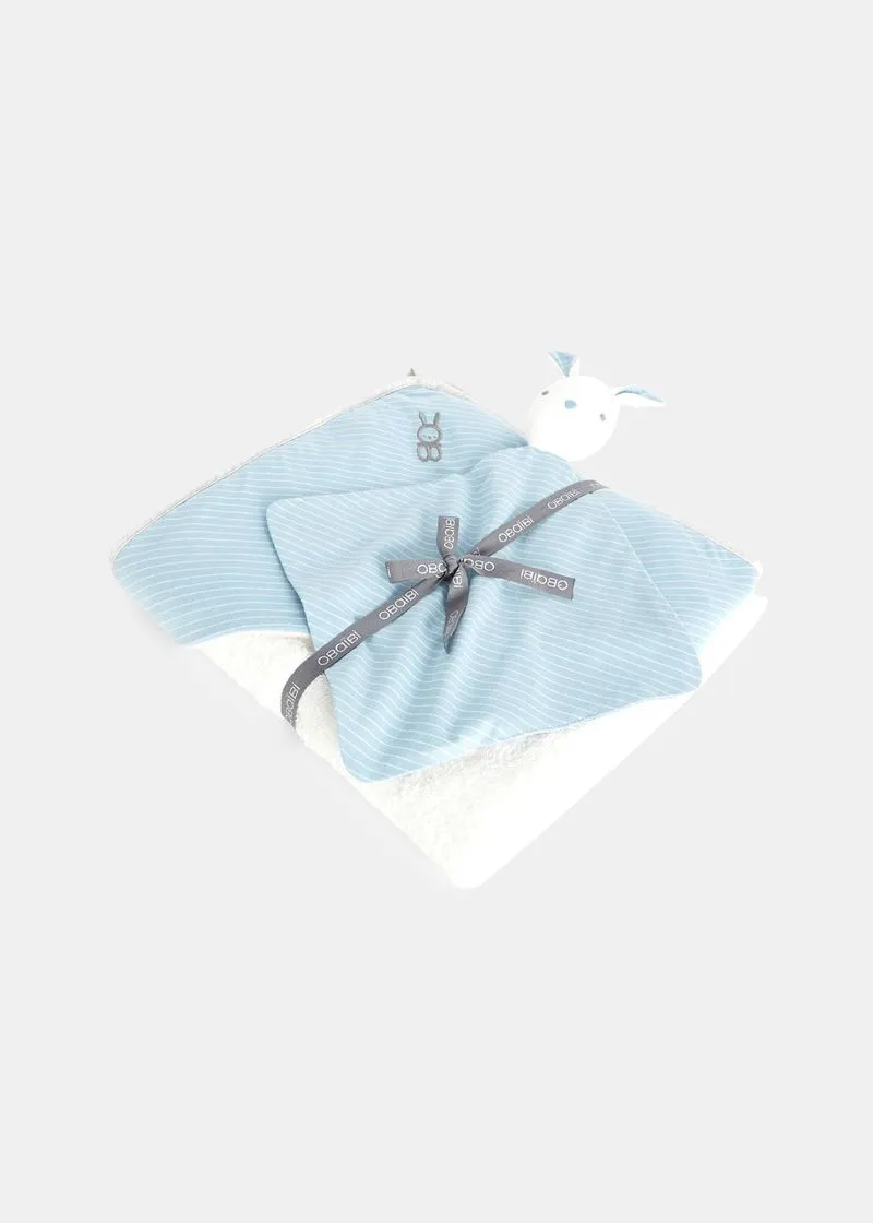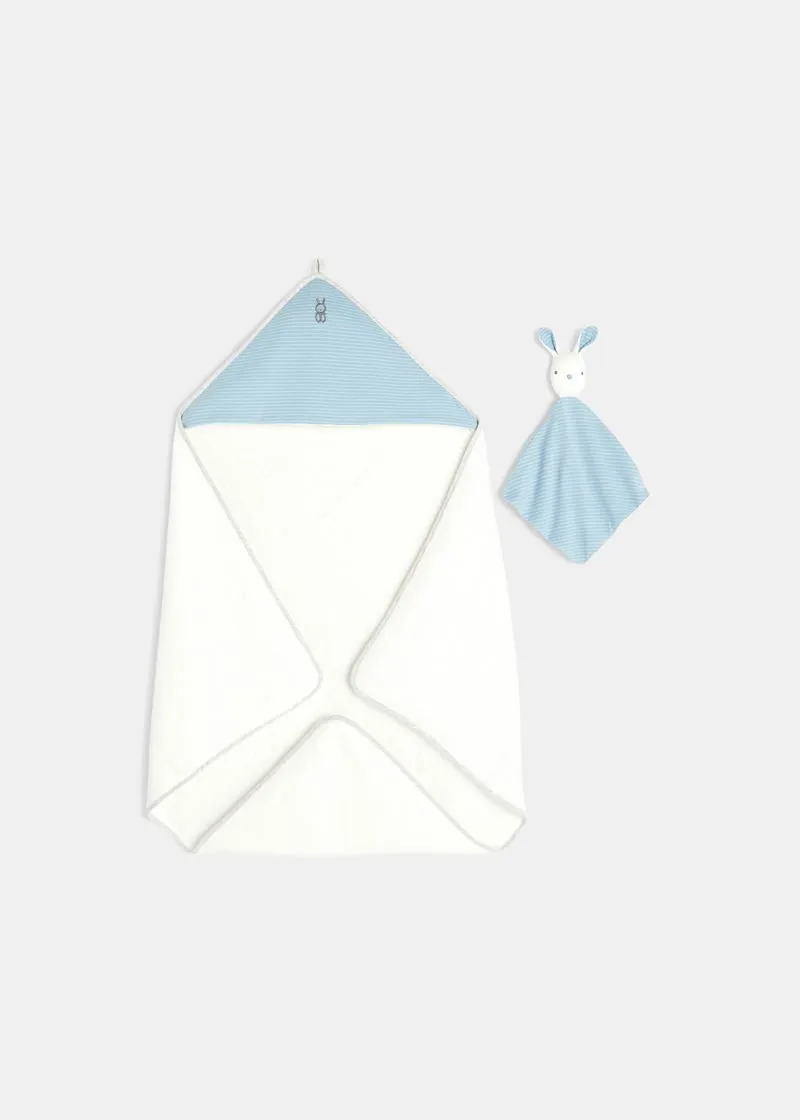Бебешки подарок за момчиња - пешкир и играчка за момчиња. Пешкирот е во форма на наметка со капа, розови линии, со големина од приближно 890 х 80 см. Играчката кадифен зајак е со големина приближно 18 х 18 см.