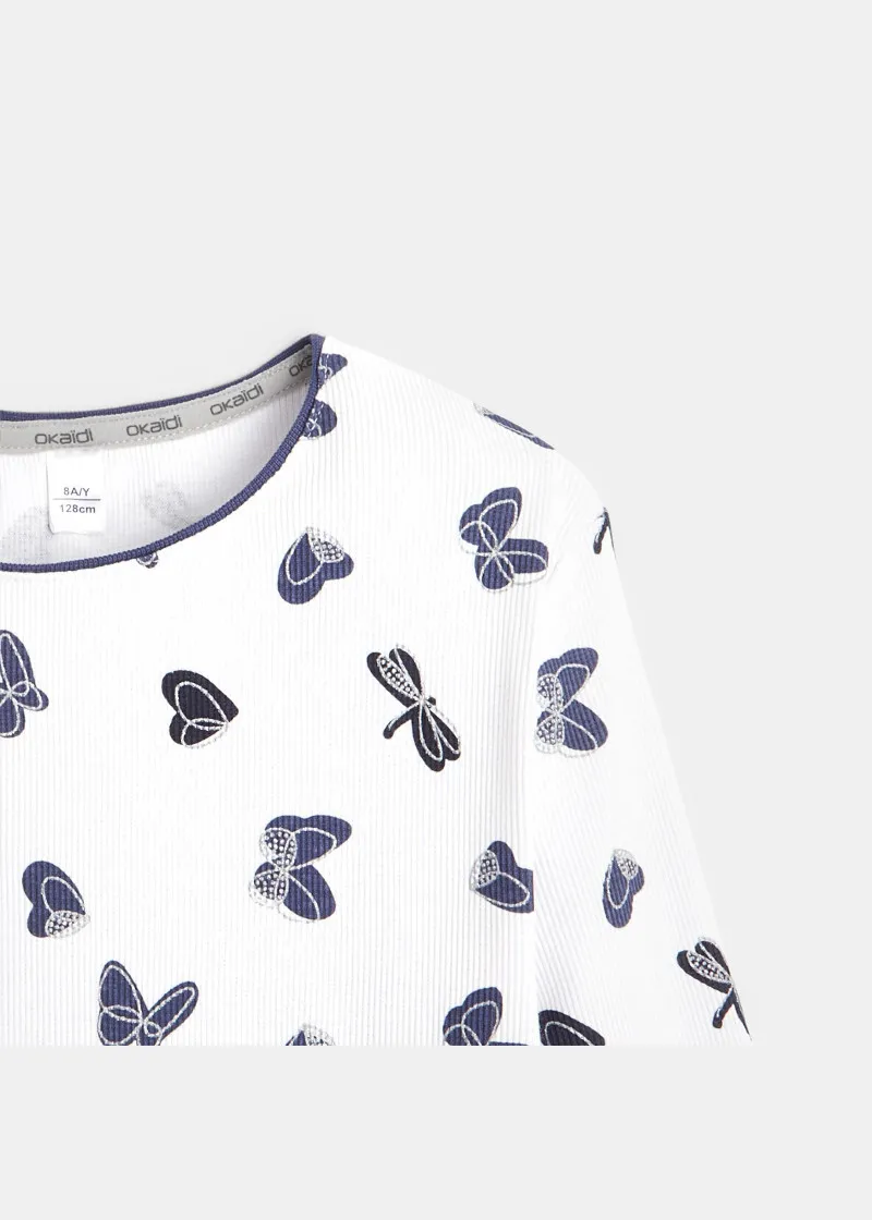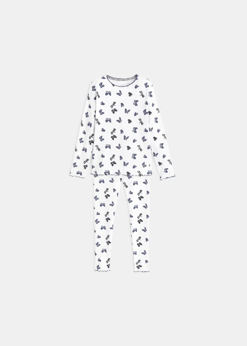 На мека и ултра еластична, фина плетена ткаенина, стилизирани пеперутки со сребрени детали елегантно се вртат наоколу. Дводелни пижами со долги ракави за совршени пижама забави со другарките! Еластична лента на струкот.