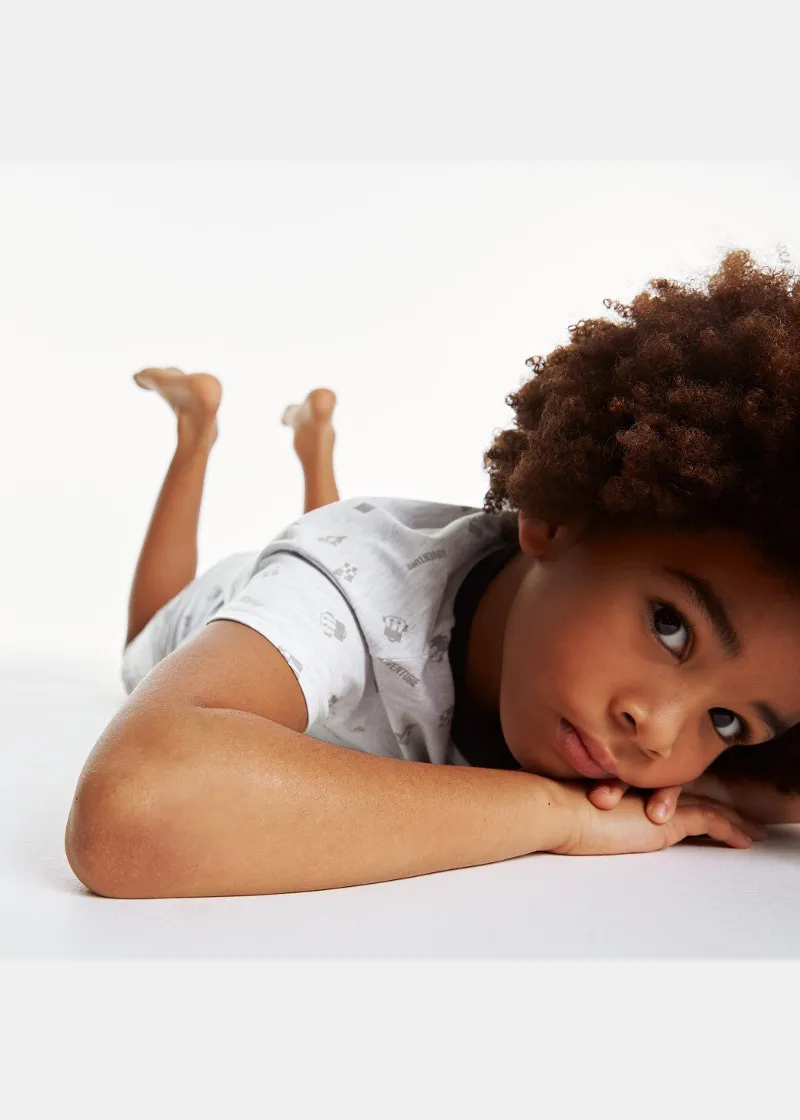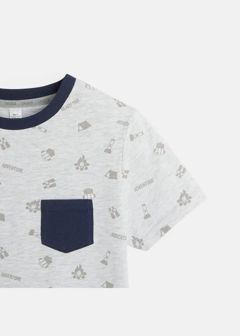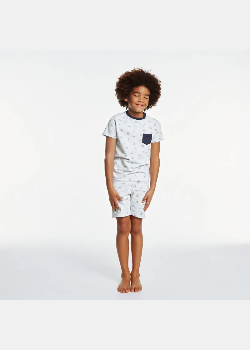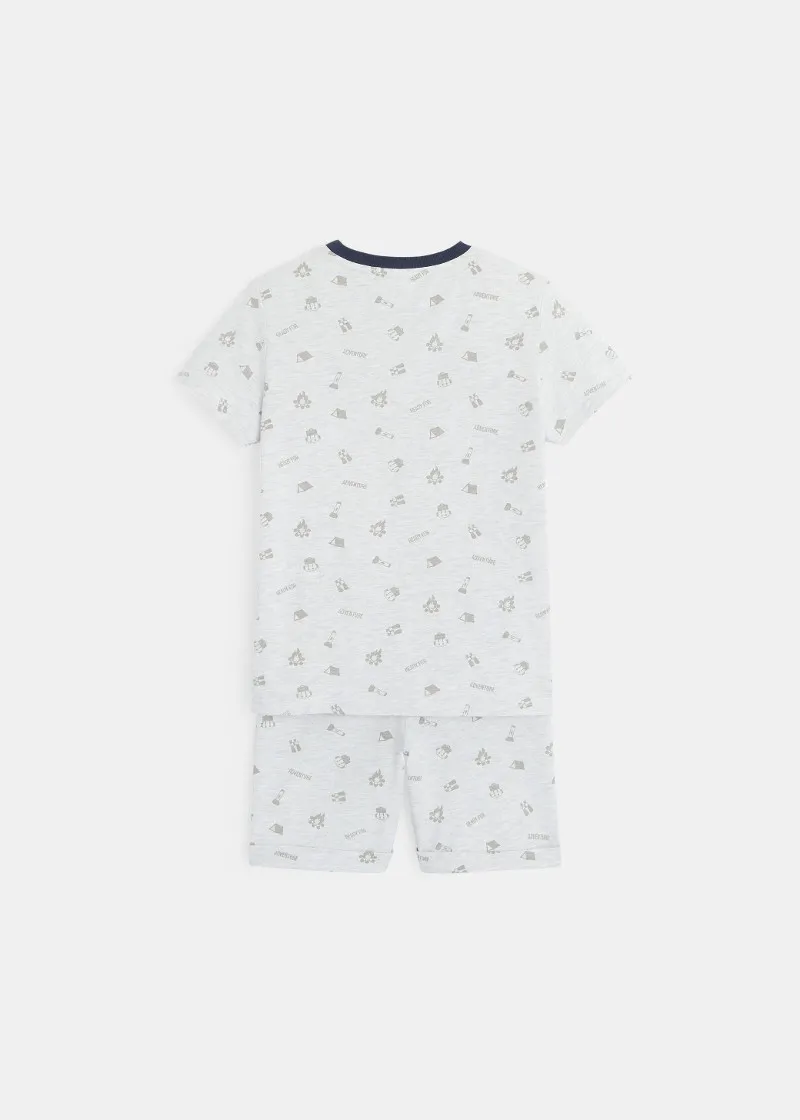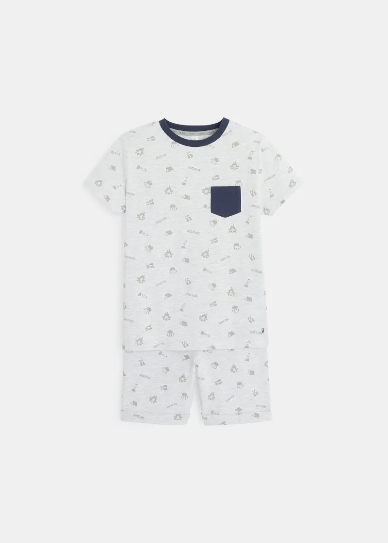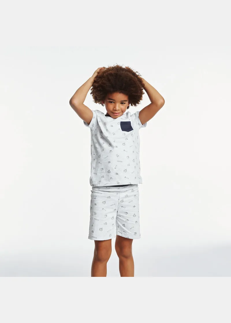 Подготвени за авантури во овие летни пижами! Дводелен сет од маичка со кратки ракави и џеб во предниот дел и бермуди со превиткани ногавици.